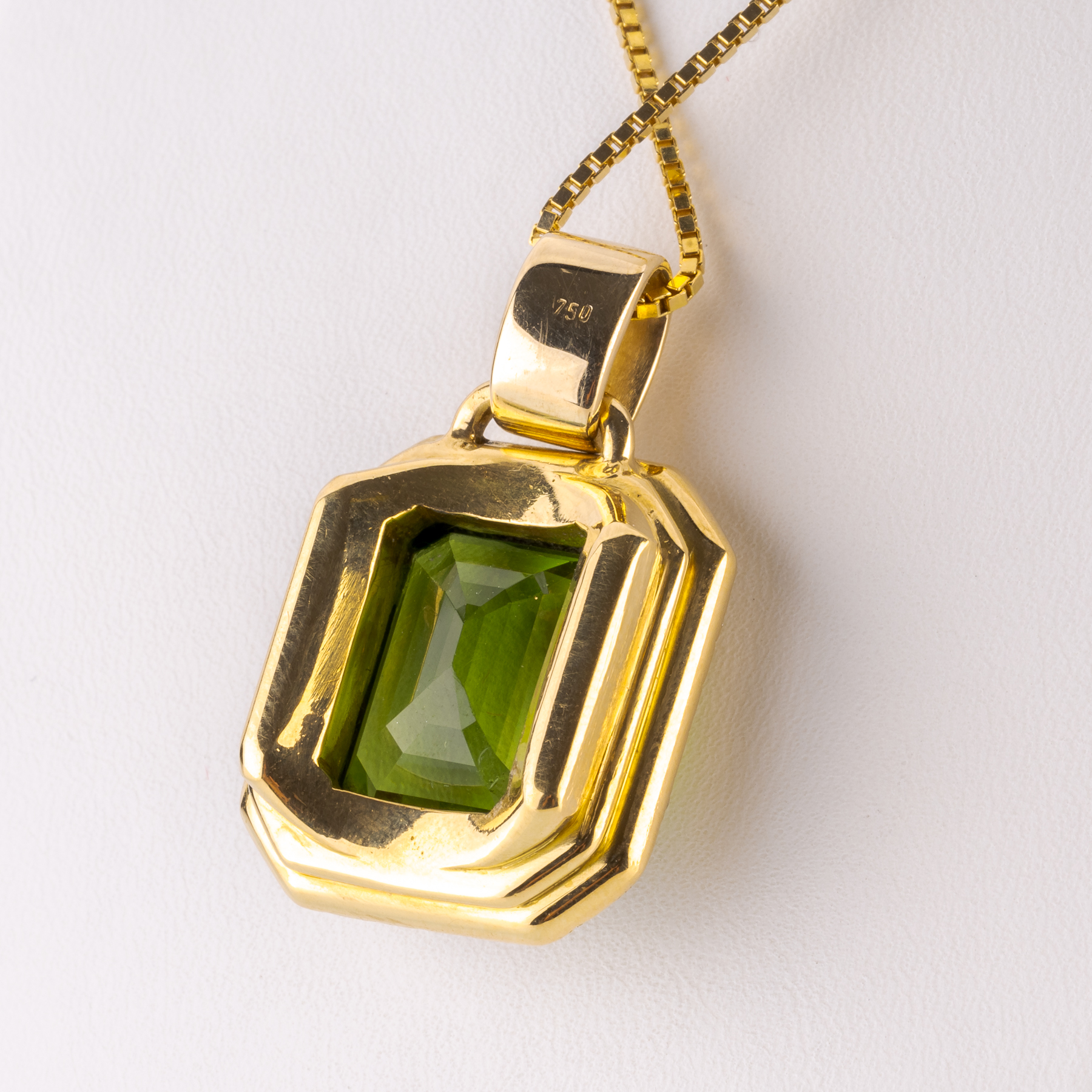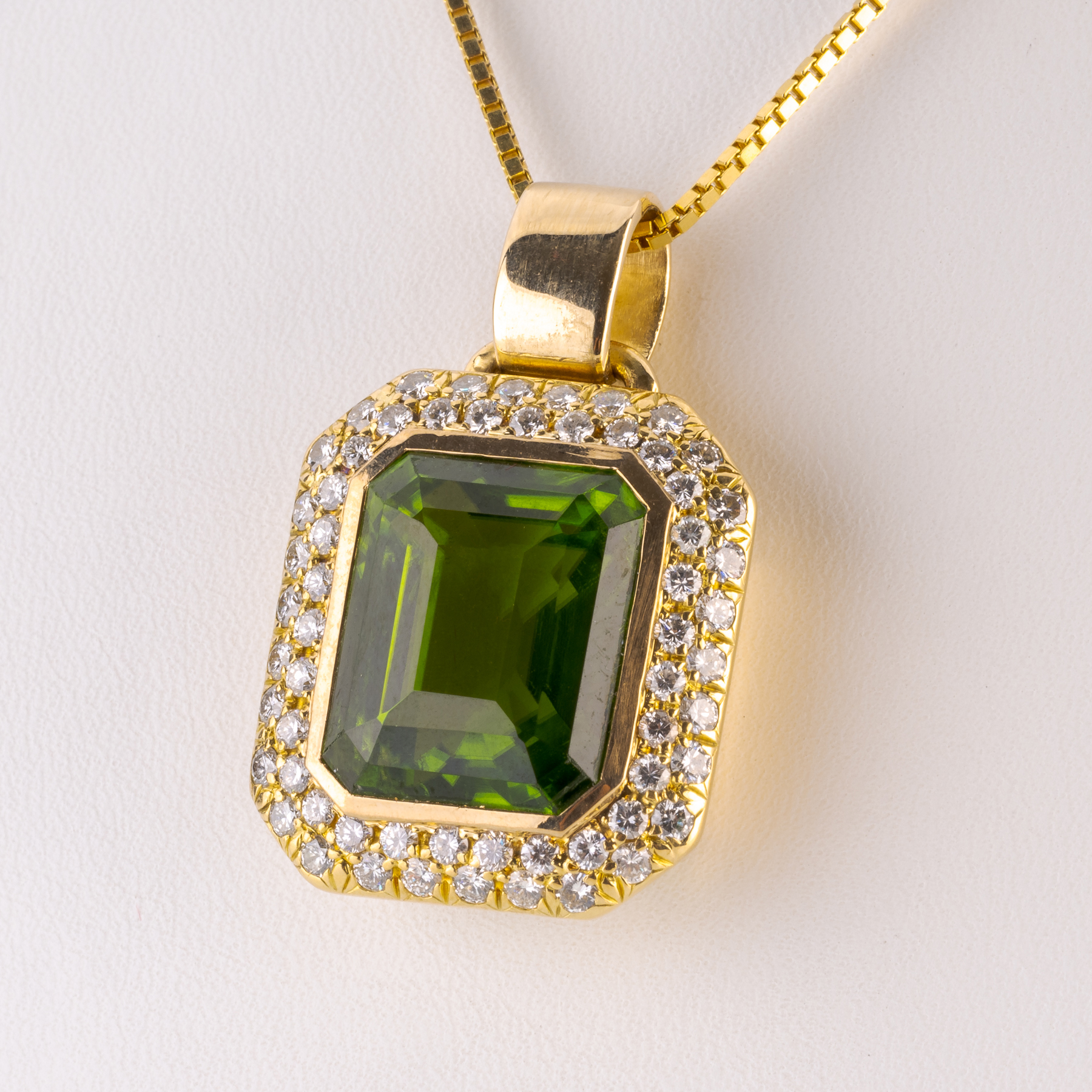 Ein Anhänger aus einem spektakulär besetztem Schmuckset sind auf jede Art und Weise beeindruckend. Ein ungewöhnlich facettierter Peridot von kräftiger Farbe trifft dabei auf ein klassisches Arrangement aus 60 Brillanten in strahlendem Weiß.