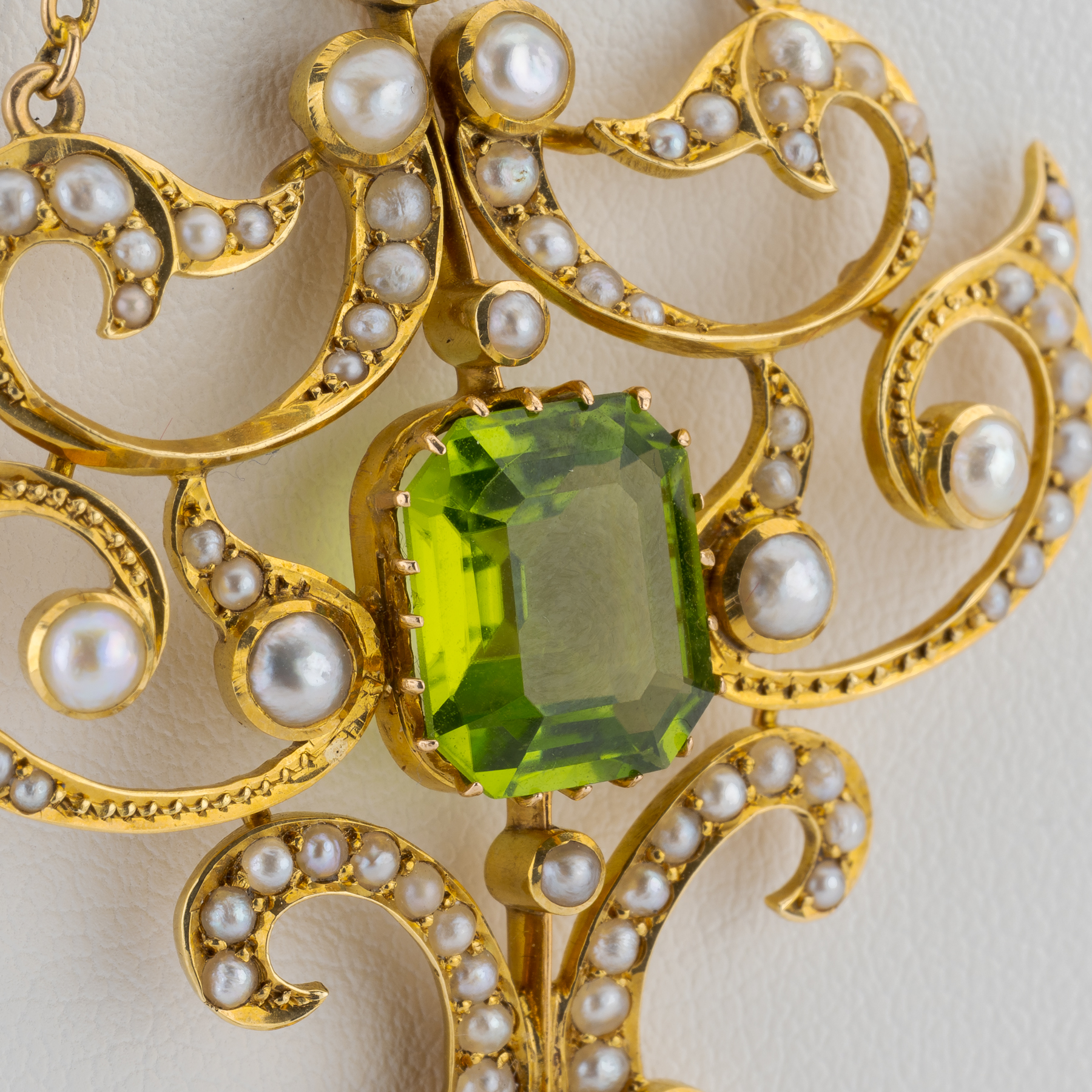 Ein prachtvoller Anhänger der Jahrhundertwende – geschaffen in einer Zeit, in der Schmuck nicht nur Zierde war, sondern Ausdruck einer Lebenshaltung. Drei leuchtend grüne Peridots fangen das Licht ein wie junges Laub im Sommerwind, während rund achtzig feine Saatperlen die geschwungenen Linien des Designs betonen.