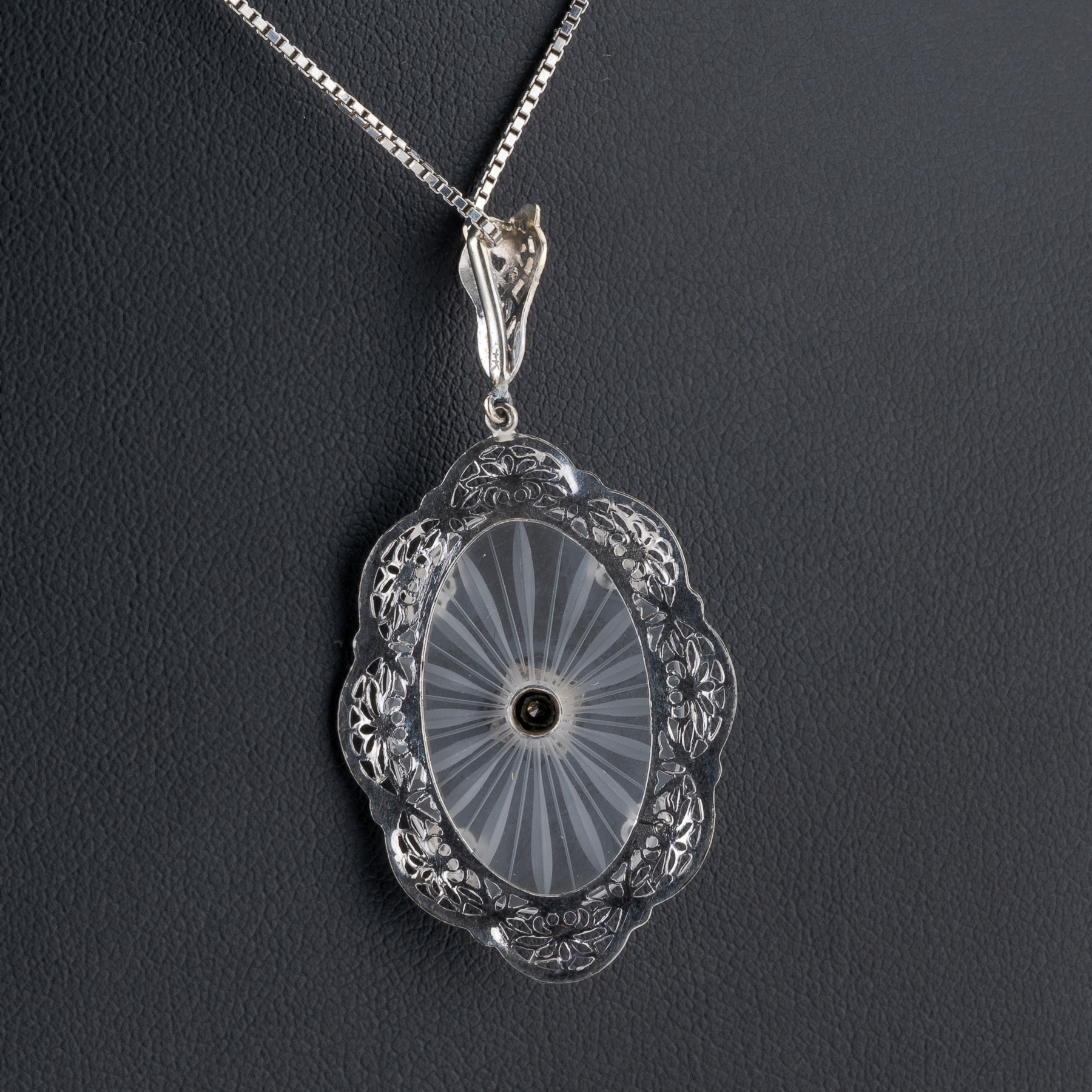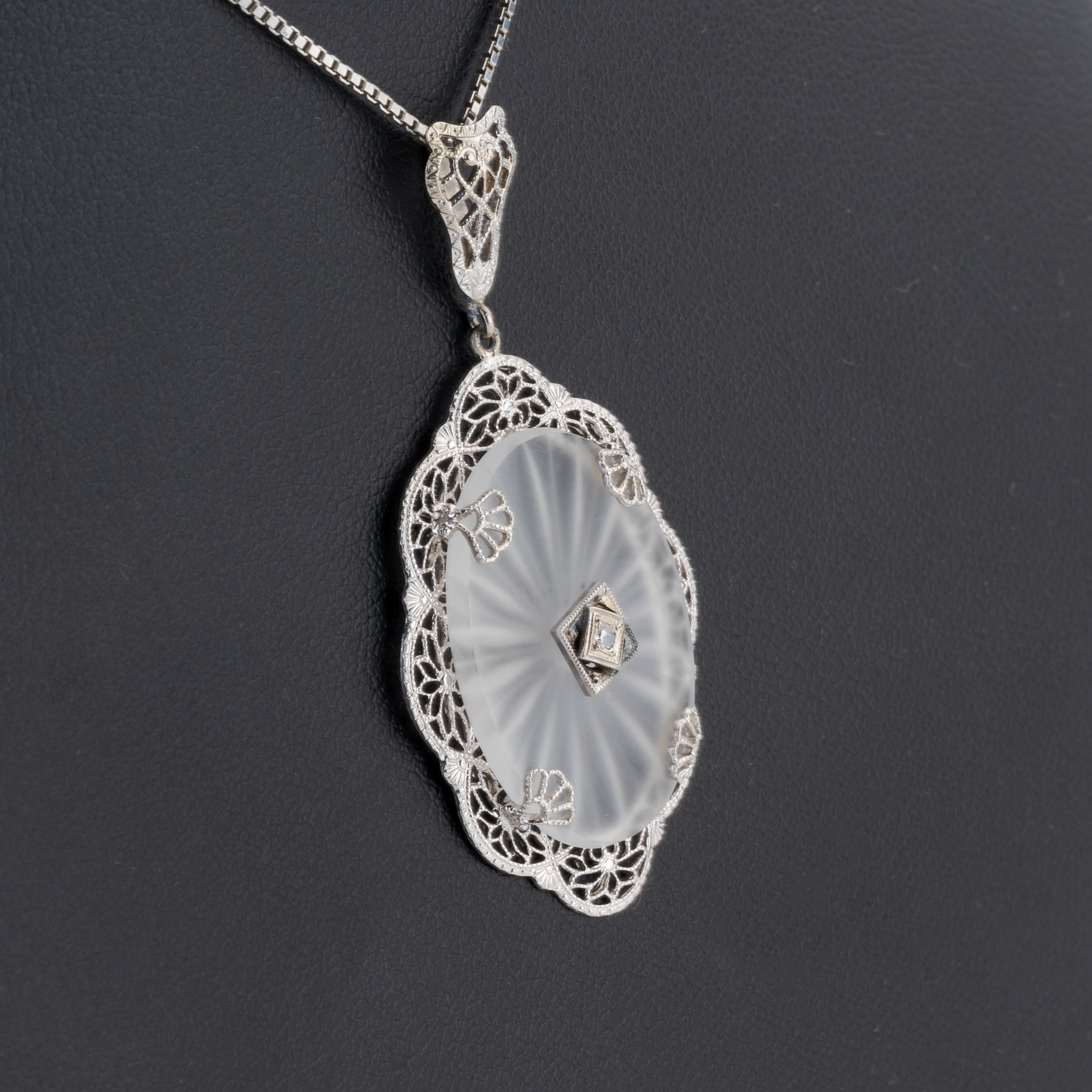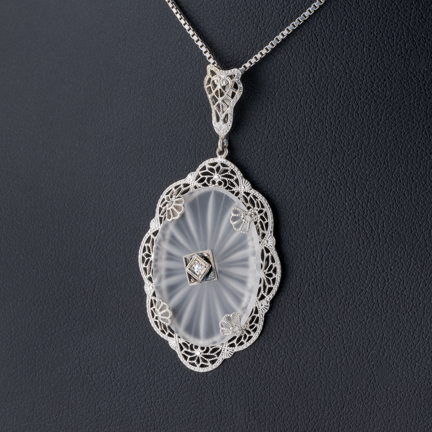 Zart wie gefrorenes Licht – Camphor Glass war in den 1920er und 30er Jahren ein Symbol für moderne Eleganz. Das milchig schimmernde Glas, mattiert und doch durchscheinend, fängt das Licht auf eigene Weise: still, klar, fast spirituell. In Kombination mit feinem Diamant und kühlem Weißgold entsteht eine Ästhetik zwischen Art Déco und Traum. Ein Schmuckstück, das Geschichte trägt – und sie leise weitererzählt.
