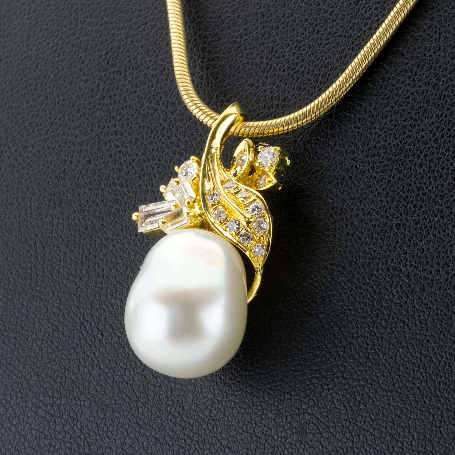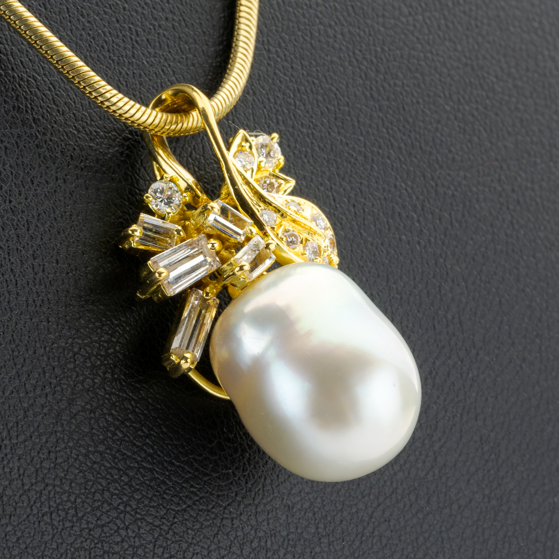 Lassen Sie sich von dem zauberhaften Anhänger mit einer Barockperle verzaubern. Er erinnert an den Schmuck vergangener Tage und ist in zarter Gestaltung in edlem Gold um die Perle herum gefertigt. 18 Diamanten runden den Anhänger auf ganz besondere Weise ab.