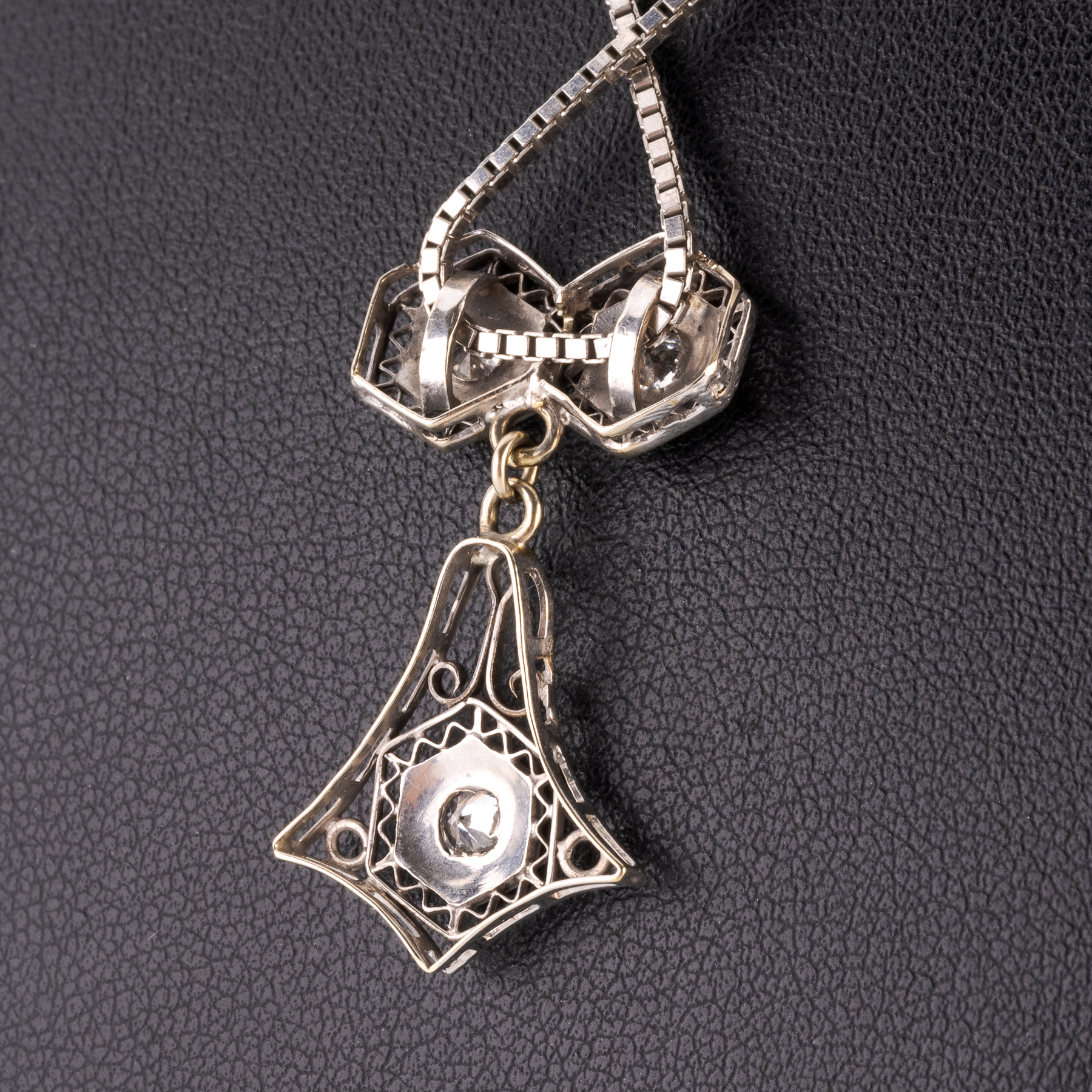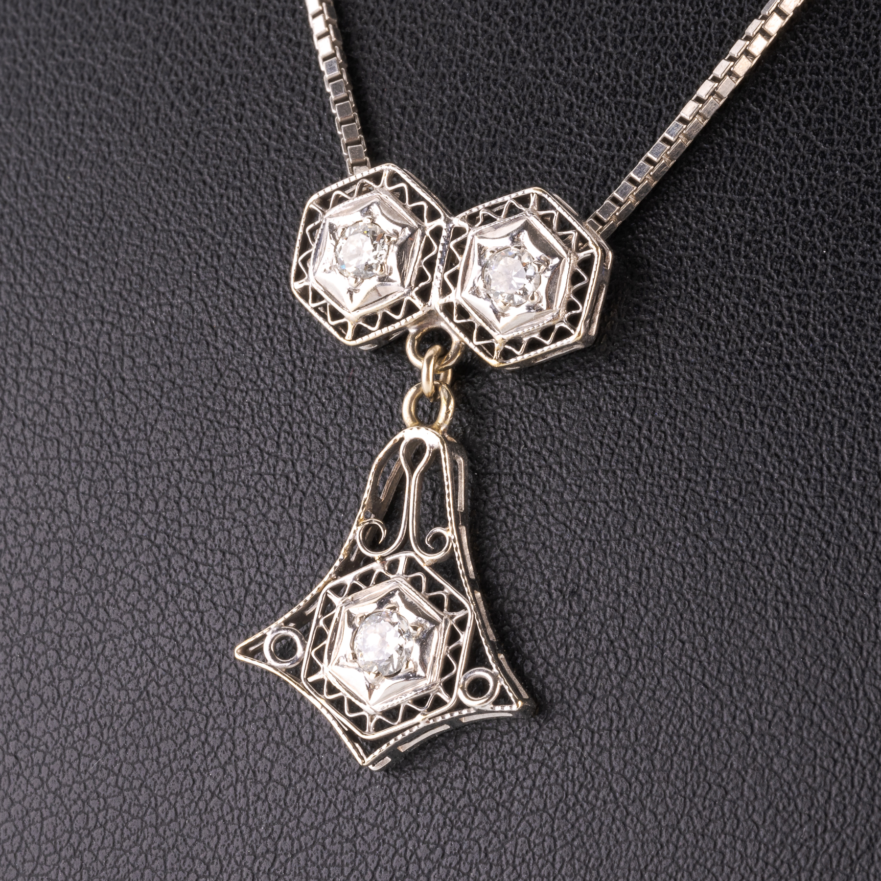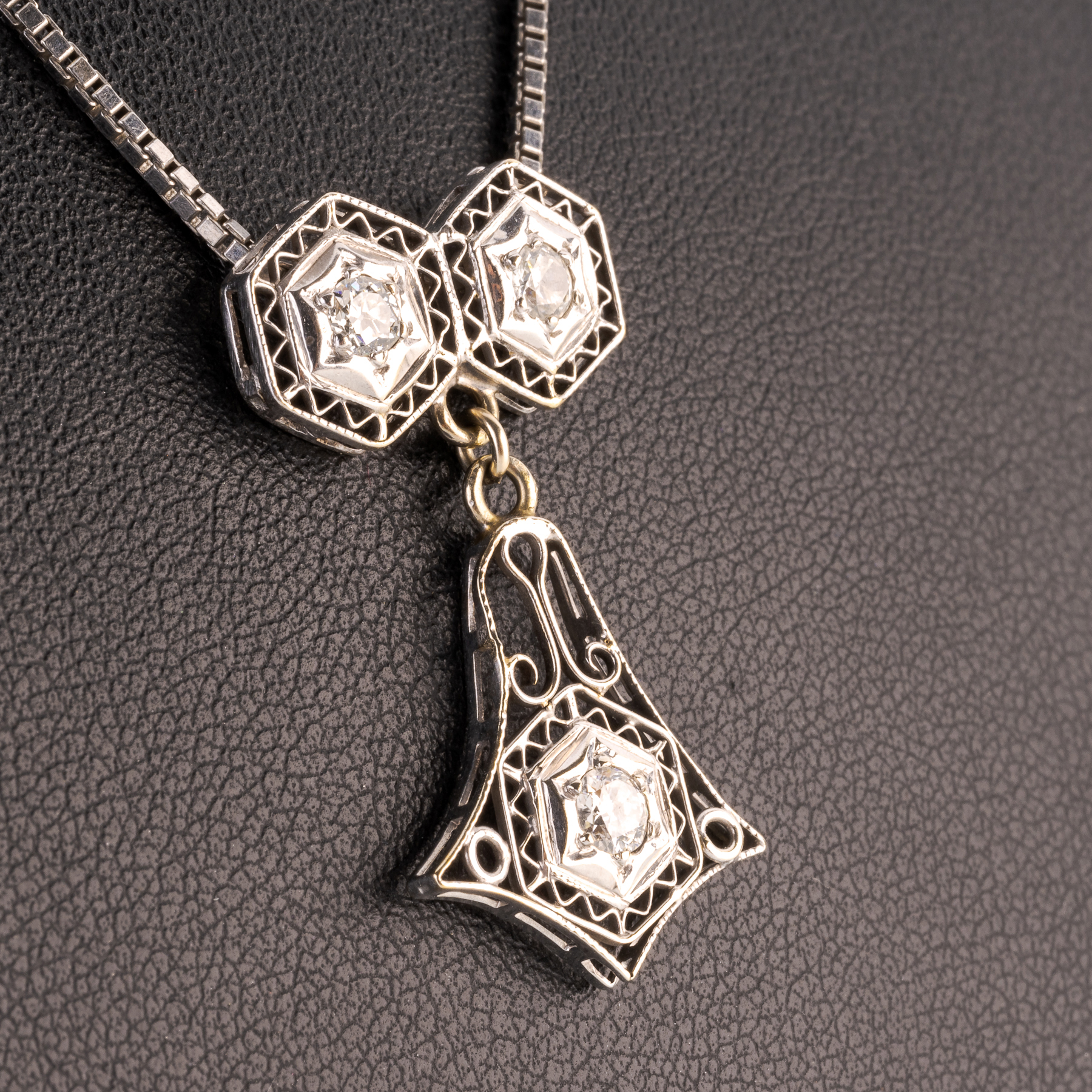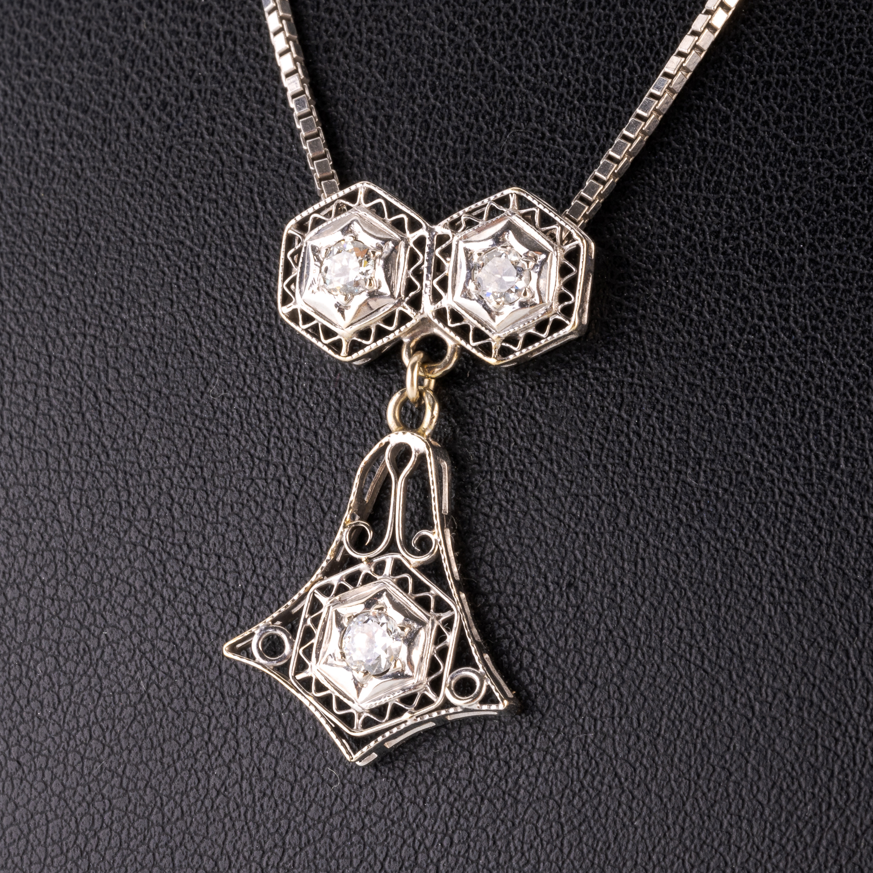 Ein filigran gearbeiteter Anhänger aus den späten 1920er Jahren, der im damals revolutionär neuen Weißgold gearbeitet wurde. Als Besatz hat man sich dabei für drei leuchtende Diamanten entschiedn.
