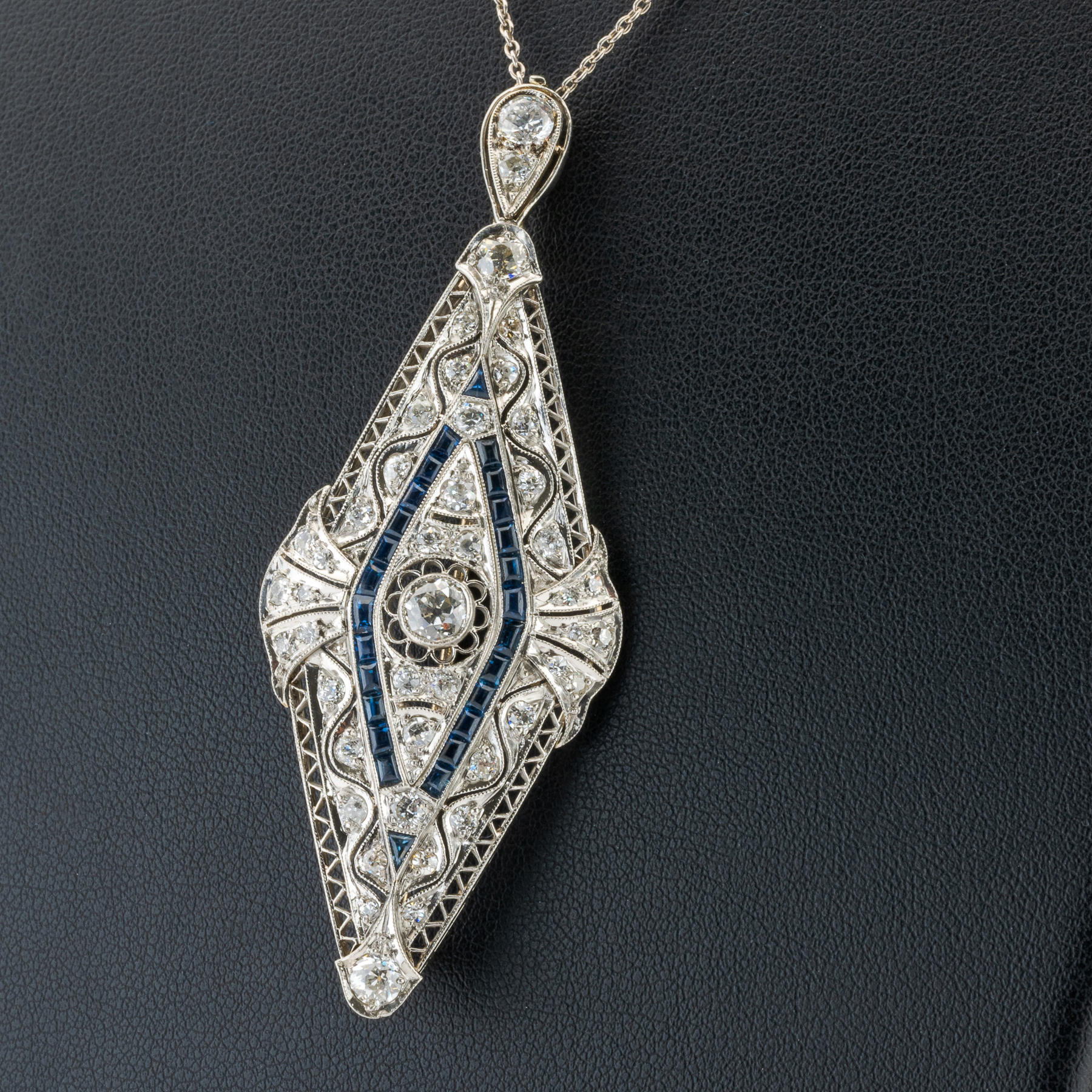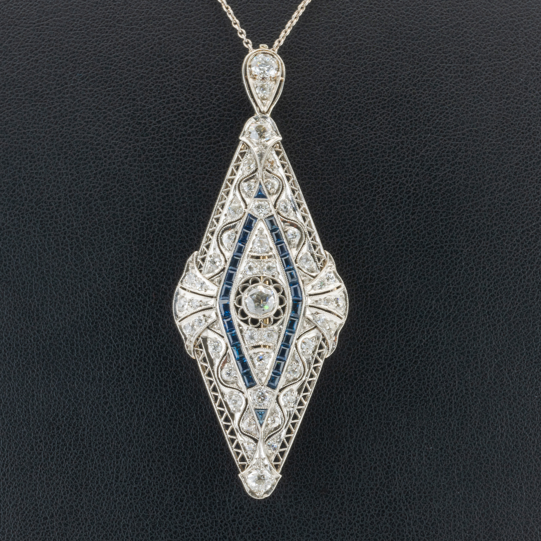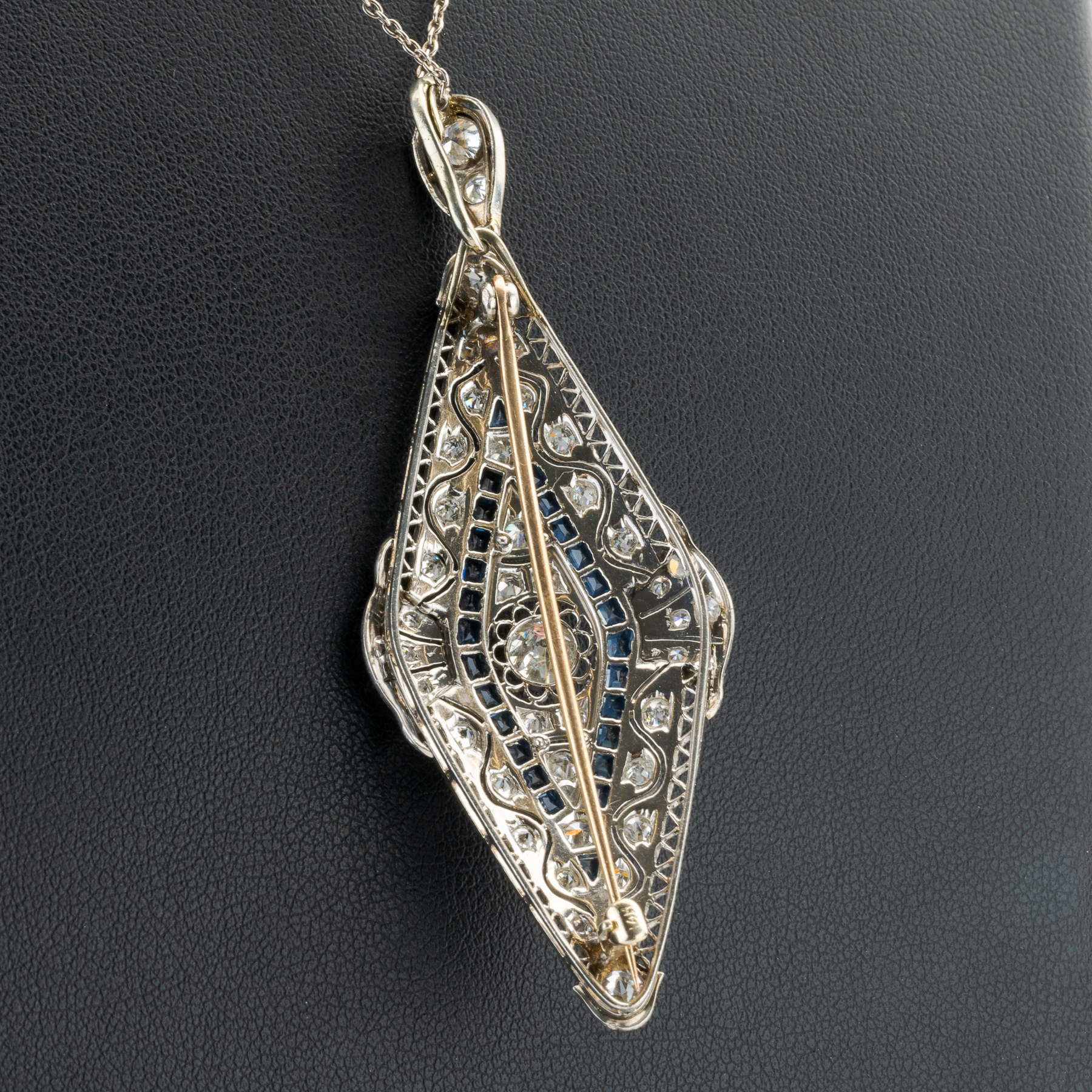 Lassen Sie sich von dieser wunderschönen Anhänger- und Broschenkombination verzaubern, die die Eleganz des französischen Art Déco Schmucks perfekt verkörpert. Das Design ist von schwungvoller Eleganz und wird von einem funkelnden Besatz von 2 Carat an Diamanten und glitzernden Saphiren aufgelockert.
