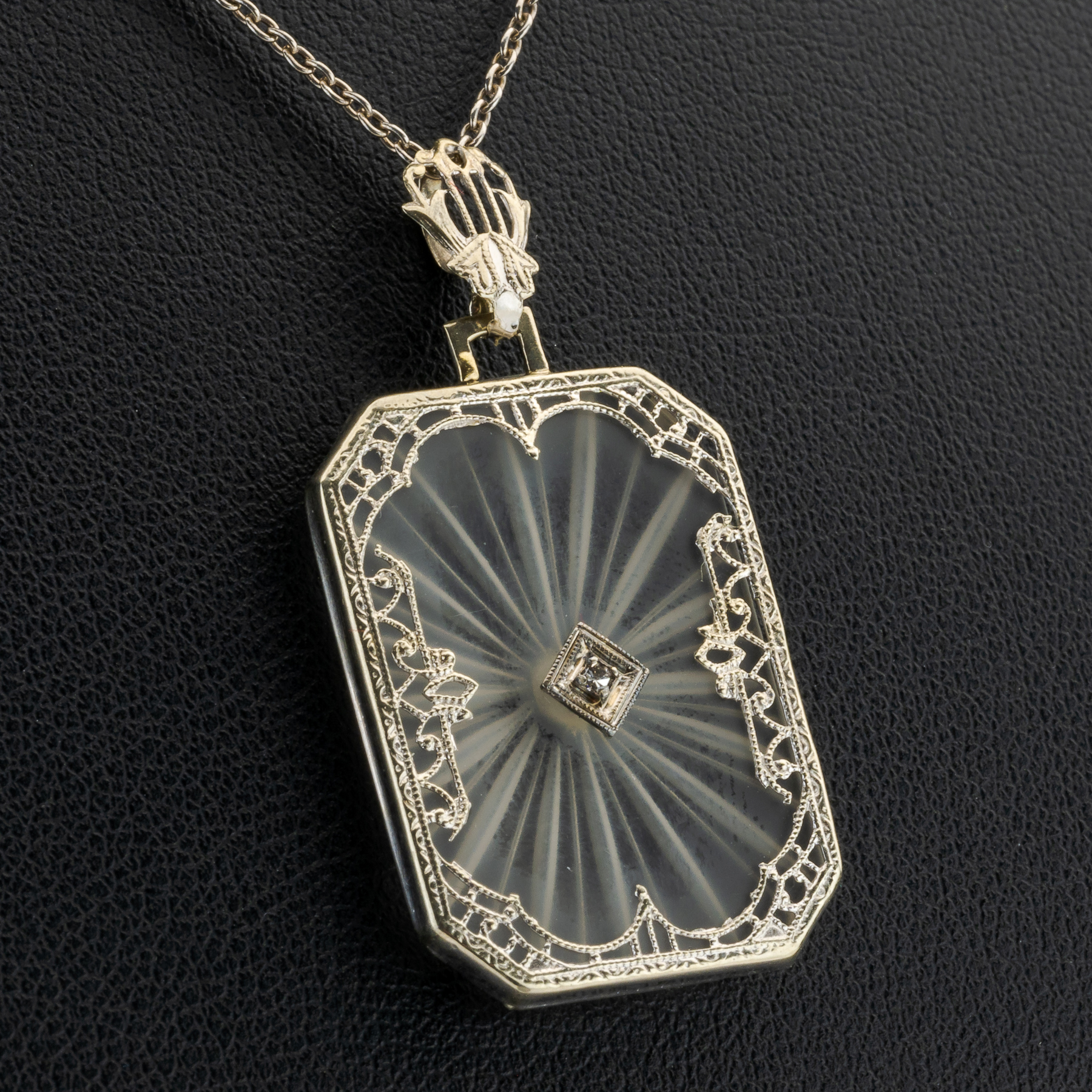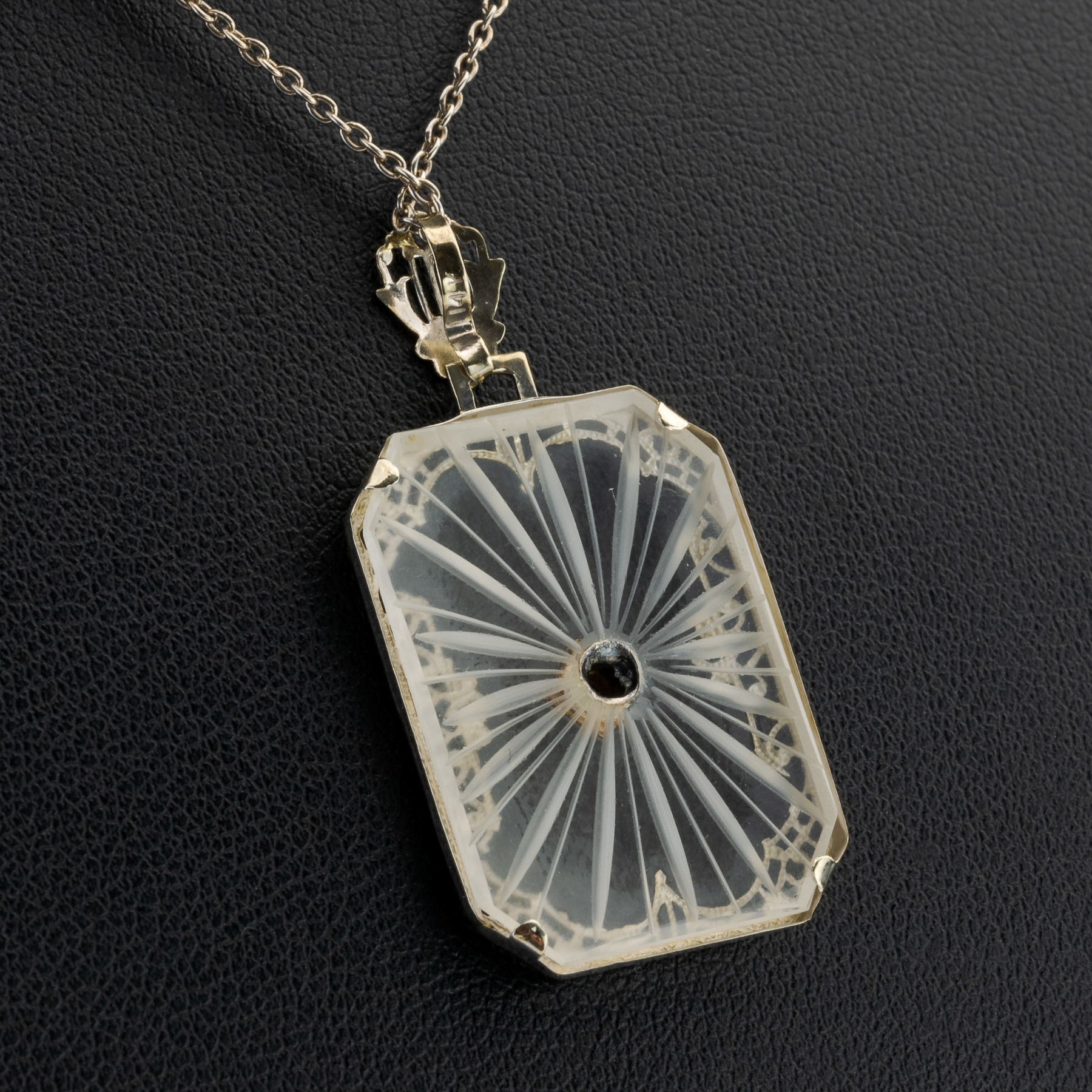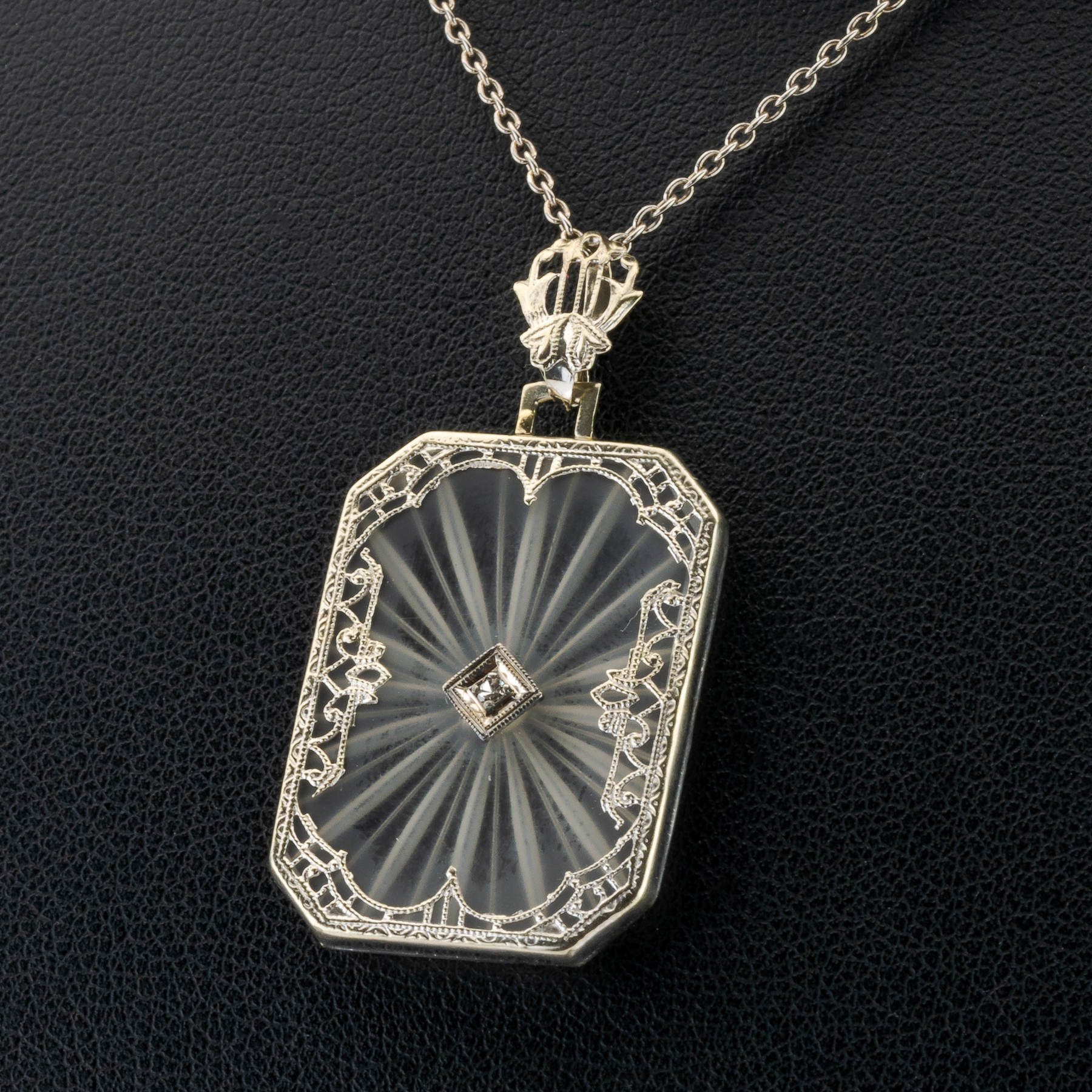 Dieser Anhänger aus den 1930er Jahren, der noch die Eleganz und Leichtigkeit vorangehender Kunststile ausstrahlt, kombiniert filigranes Design in edlem Weißgold mit dem sogenanntem Camphor Glas im zeittypischen Strahlenmuster. Dieses wird elegant mittig von einem einzelnen funkelnden Diamanten komplettiert und macht das Stück zu einer zeitlosen Schönheit, die auch nach einem Jahrhundert spielend neben modernen Schmuckstücken besteht.