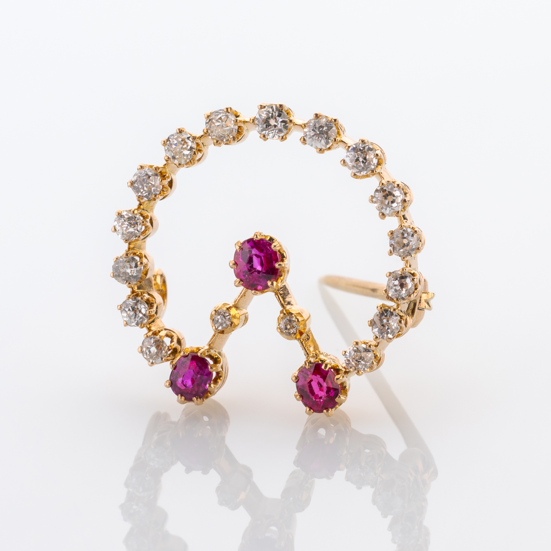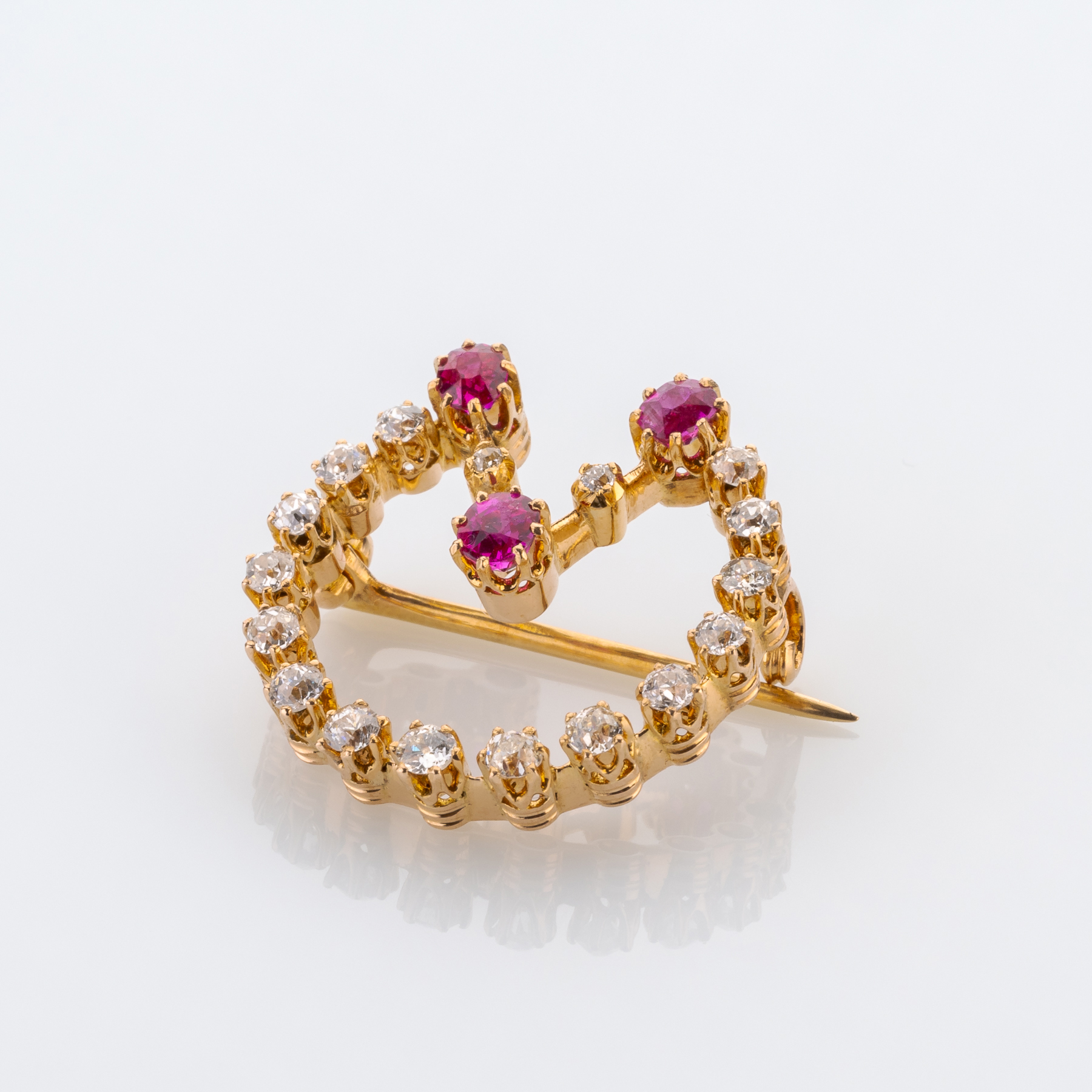 Diese beeindruckende Brosche aus den 1930er Jahren in Deutschland ist ein glänzendes Beispiel für feine Handwerkskunst und zeitlose Eleganz. Geschickt aus Gold gefertigt, wird sie von drei leuchtenden Rubinen dominiert, die durch ihre kräftige Farbe sofort ins Auge fallen. Umschlossen von 17 glitzernden Altschliffbrillanten, die ein funkelndes Halo bilden, ist diese Brosche ein echter Hingucker. Die zierliche und elegante Gestaltung macht sie zu einem diskreten, aber dennoch markanten Schmuckstück. Perfekt für Liebhaber von antikem und edlem Schmuck, wird diese Brosche sicherlich Generationen überdauern und weiterhin bezaubern.