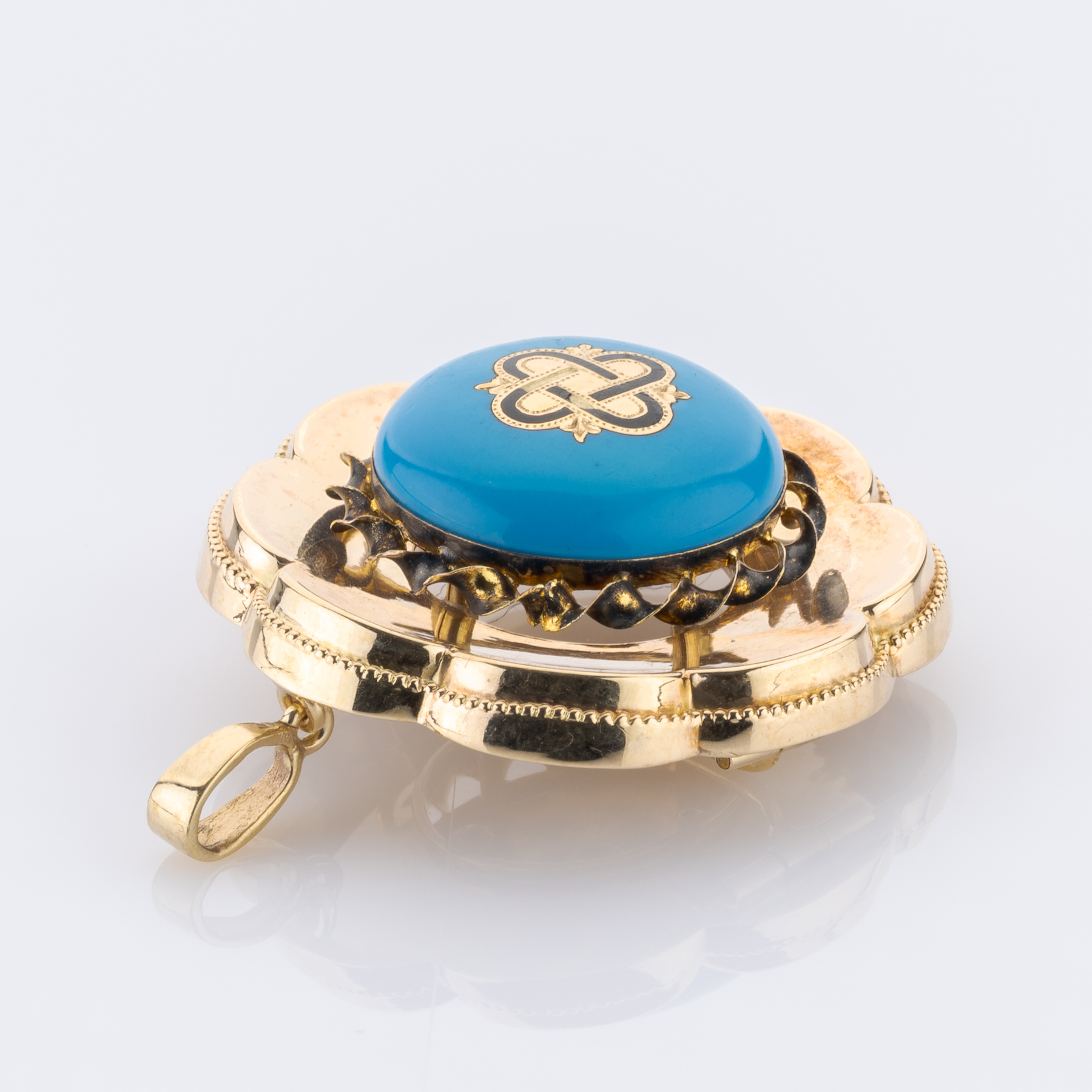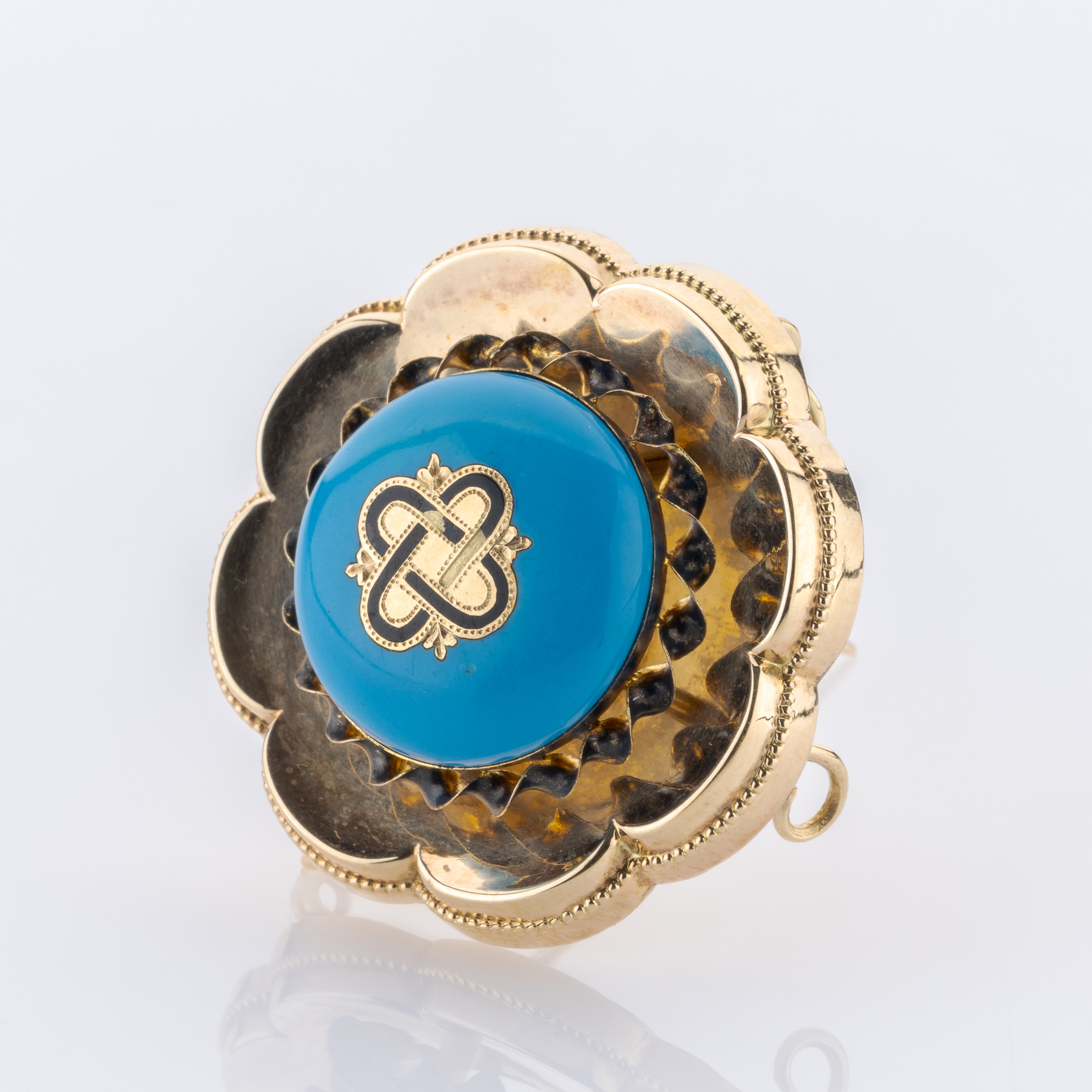 Ein Schmuckstück aus dem 19. Jahrhundert, das den Geist der viktorianischen Epoche atmet – kunstvoll, symbolisch und voller Ausdruckskraft. Die runde Brosche aus Gelbgold vereint das leuchtende Blau eines Türkis mit schwarzer Emaille und feiner Ornamentik. Das zentrale goldene Emblem verweist auf die romantische Symbolsprache jener Zeit, in der Schmuck Erinnerung, Verbundenheit und Stil zugleich verkörperte. Der harmonische Kontrast von Farbe und Form verleiht diesem Stück eine stille Noblesse und den Charakter eines authentischen Zeitzeugen.