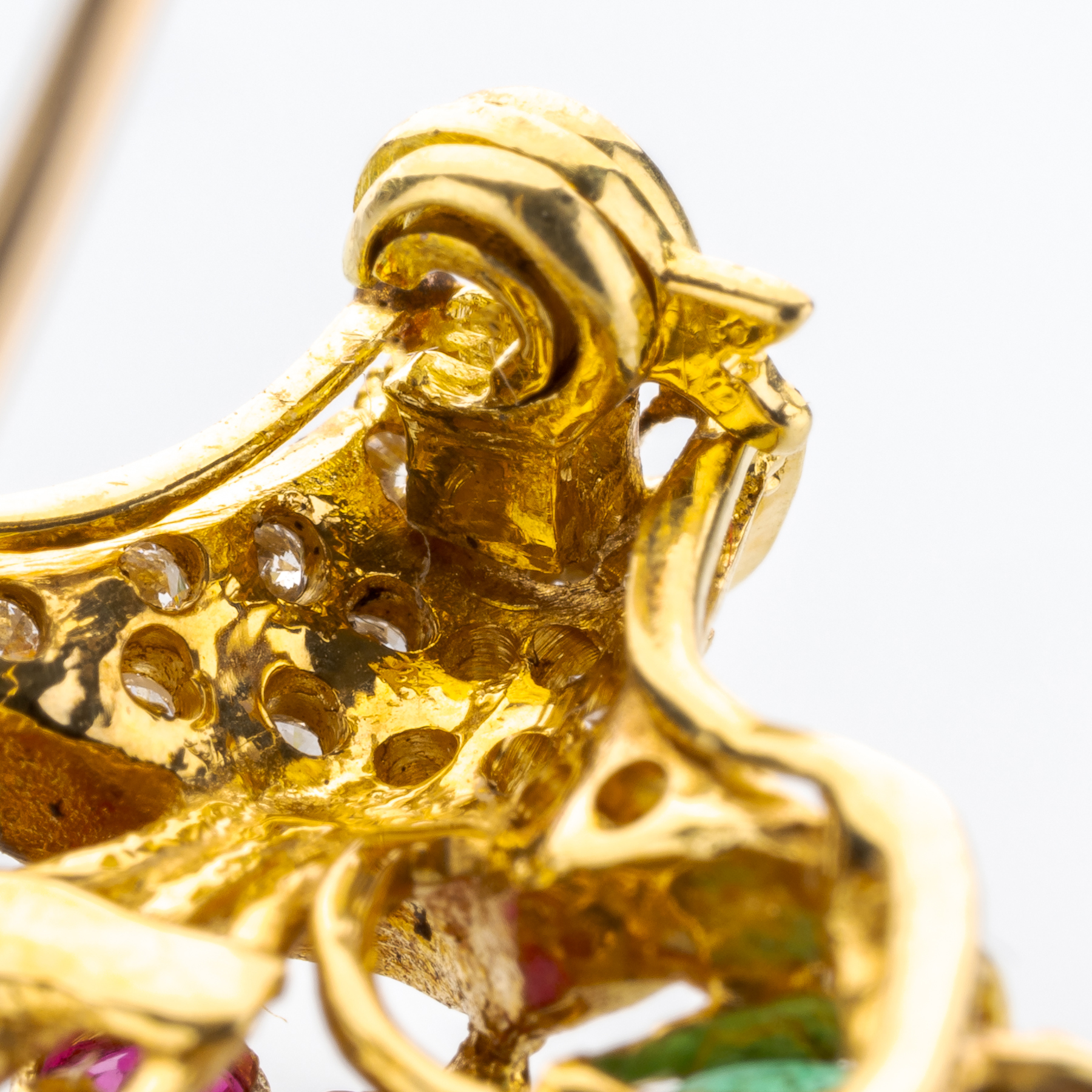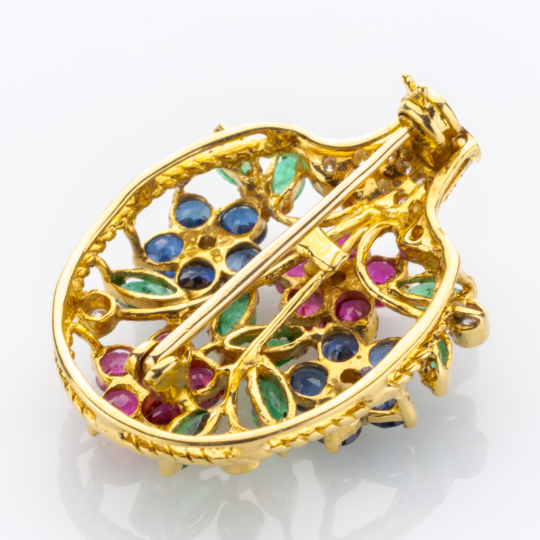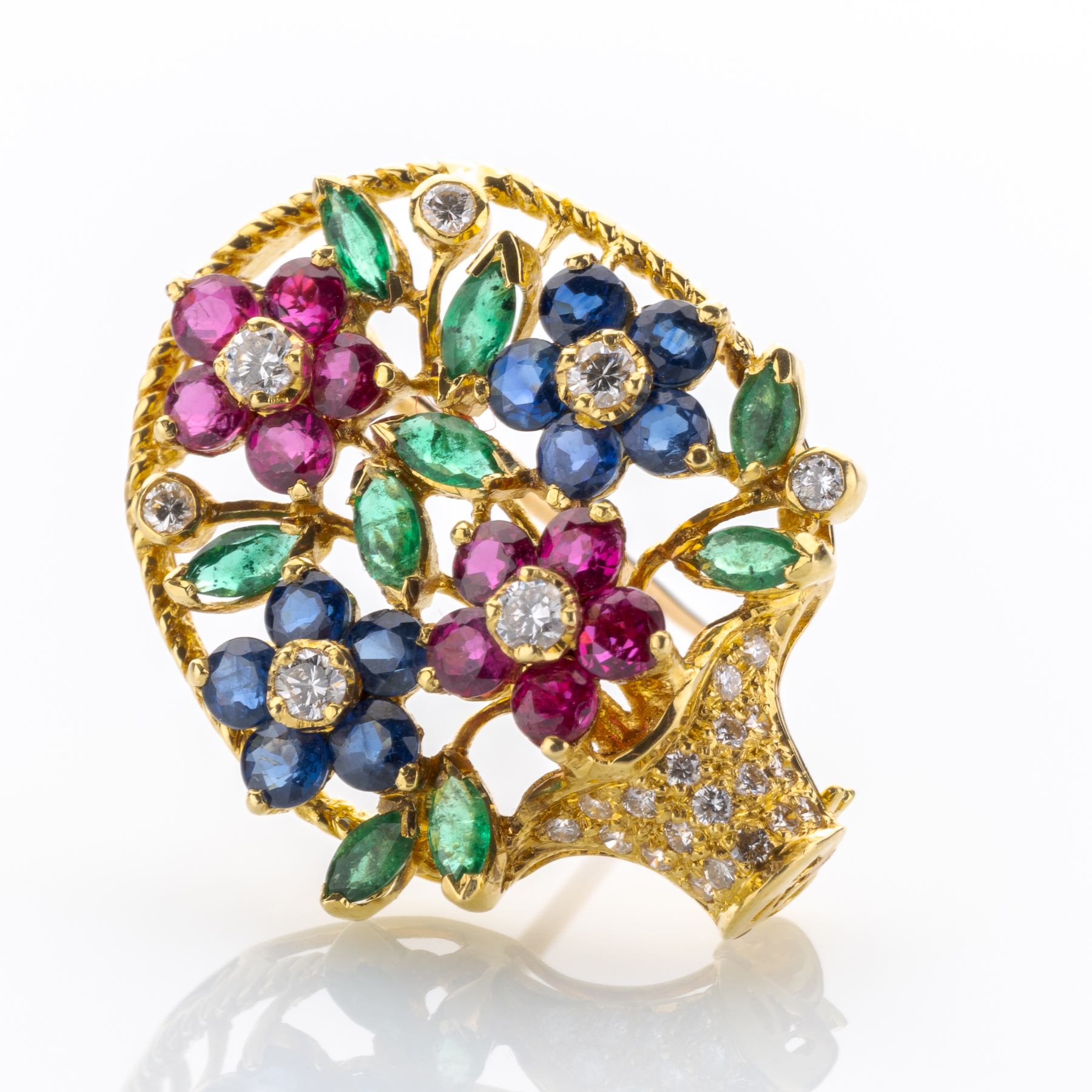 Florale Motive sind schon lange beliebt im Schmuckdesign, und dieses Stück aus den 1960er Jahren greift dabei bis auf die Jahrhundertwende zurück. Beim Edelsteinbesatz ist man dabei der Tradition aus den 1980ern, die “großen Vier” der Edelsteinwelt – Saphir, Rubin, Smaragd und Diamant – zu verwenden.