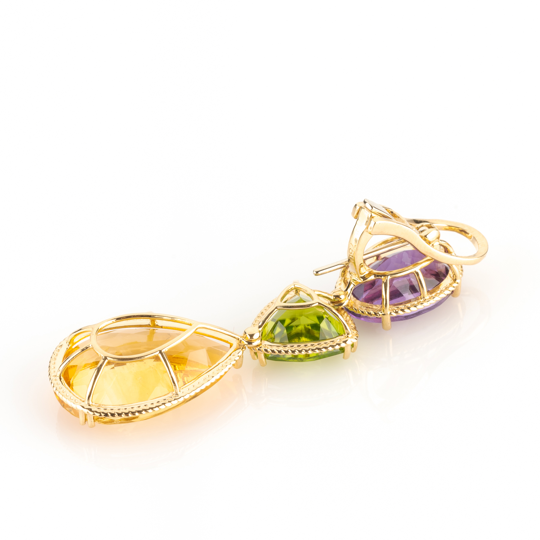 Dieses eindrucksvolle Paar Ohrringe wurden eindeutig für Liebhaberinnen von Farbsteinen geschaffen! Als Besatz wurden dabei verschieden facettierte Amethyste, Citrine und Peridots verwednet, und in eine minimalistische Fassung gesetzt, um den Farbedelsteinen die volle Aufmerksamkeit einzuräumen.