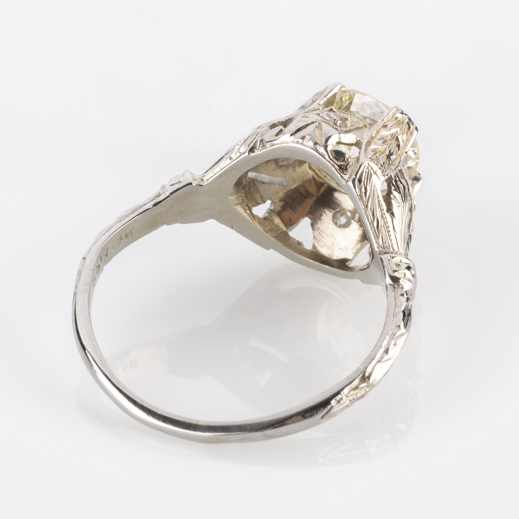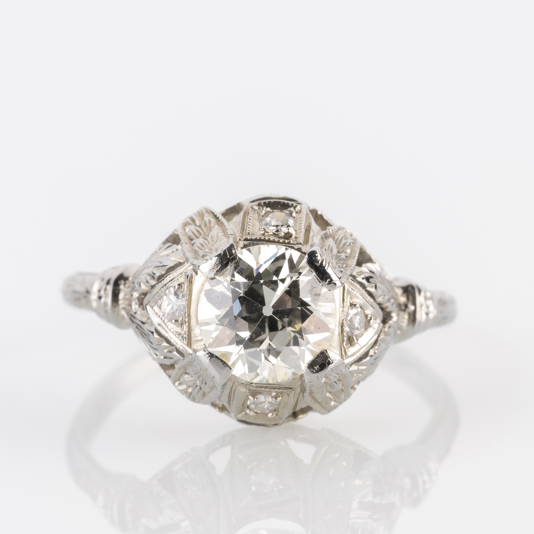 Dieses Prachtstück aus den 1930er Jahren ist ein beeindruckendes Beispiel dafür, warum die Art Deco Periode wohl zu den beliebtesten Kunstepochen gehört. Filigrane, detailreiche Handwerkskunst trifft dabei auf zeitloses Design und lenkt alle Blicke auf den zentralen Einkaräter.