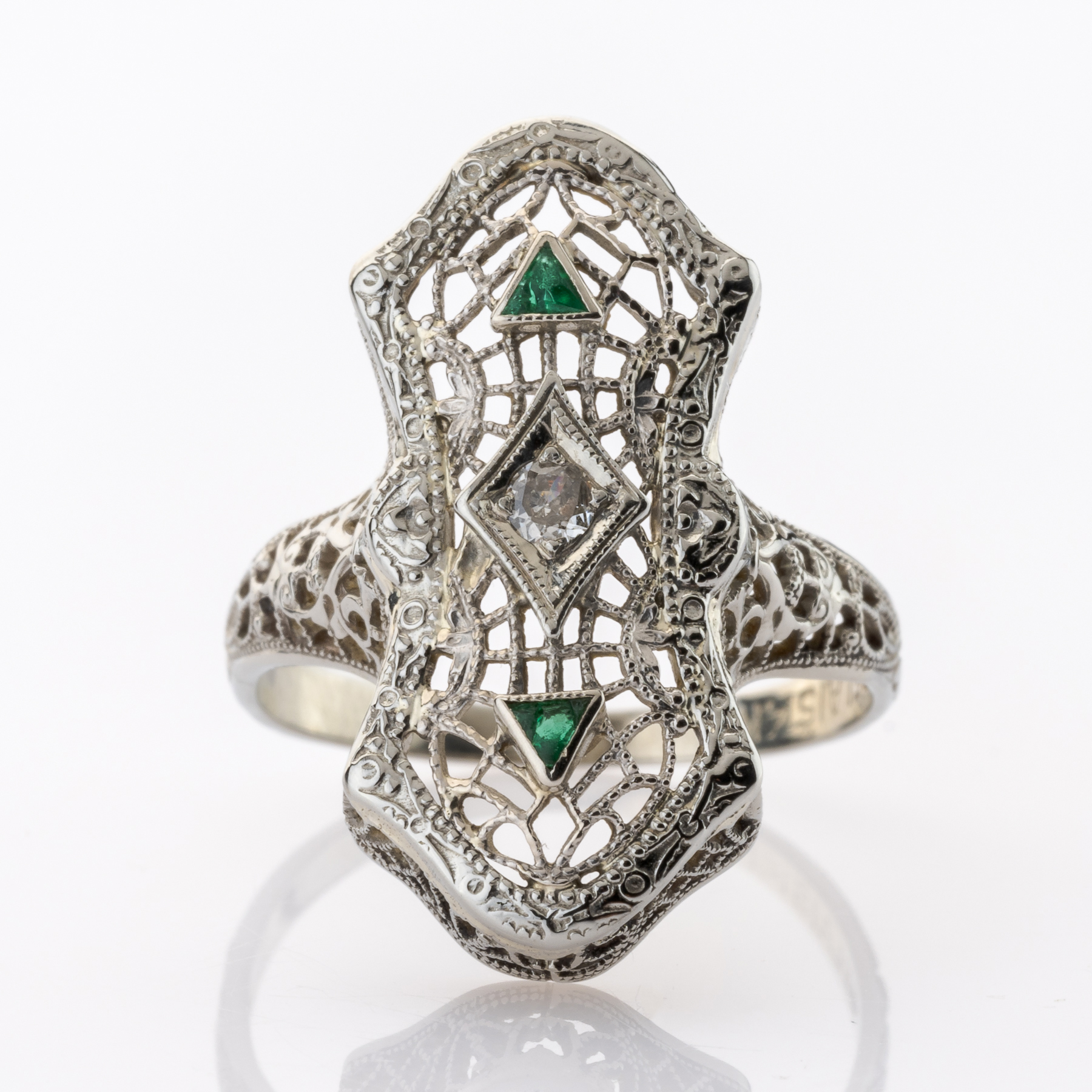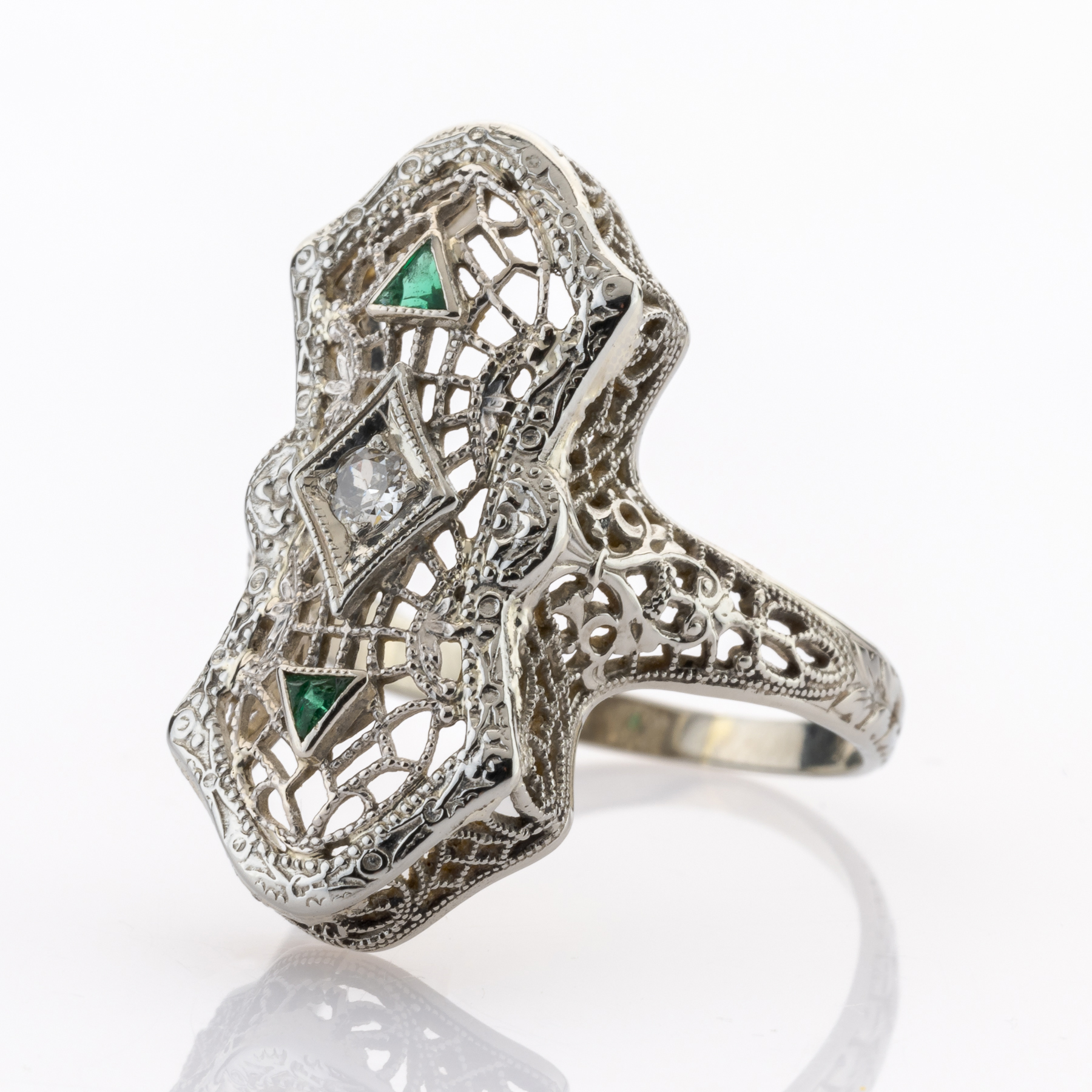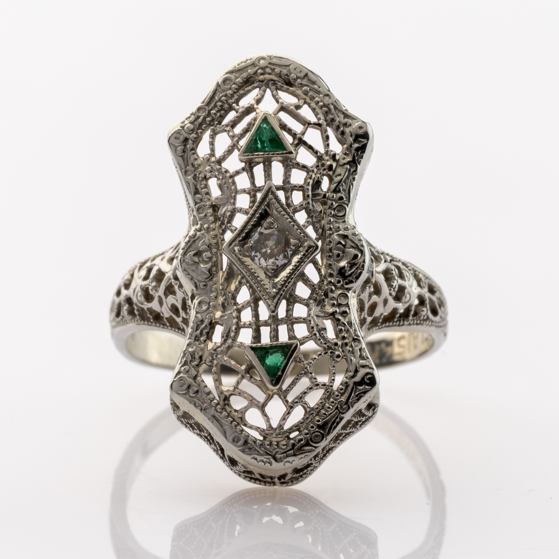 Dieses Stück aus den späten 1920er Jahren bringt nahezu alle Elemente mit sich, die für diese berühmte Epoche stehen. Filigrane Arbeit trifft dabei auf einen strahlend weißen Brillanten, und zwei facettierte Smaragde lockern das Schmuckstück farblich nochmals auf. Ganz besonders hervorzuheben ist die Herkunft aus der Belais Manufactuing Co. in den USA, die zu den ersten Herstellern von Schmuck aus Weißgold gehörten.