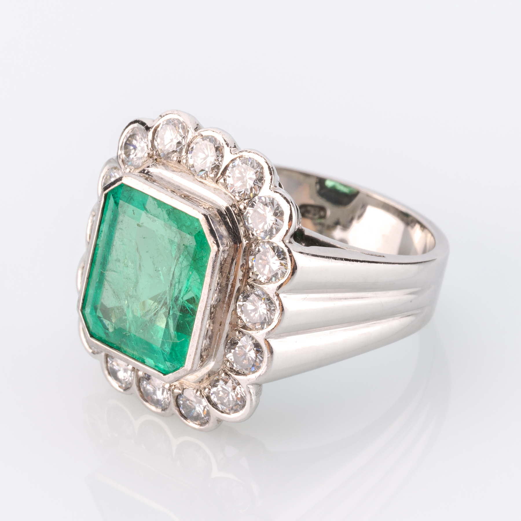 Dieser exquisite Cocktailring ist ein wahrer Blickfang und besticht durch einen strahlenden Smaragd von 5,5 Karat in leuchtendem Grün, umgeben von 16 glitzernden Brillanten. Die leuchtende Farbe des Smaragds wird durch den hellen Weißgoldring und die funkelnden Diamanten, die ihn umgeben, dabei besonders betont. Mit seinem unvergleichlichen Charme und außergewöhnlichem Besatz ist dieser Ring definitiv eine Bereicherung für jede Schmucksammlung.