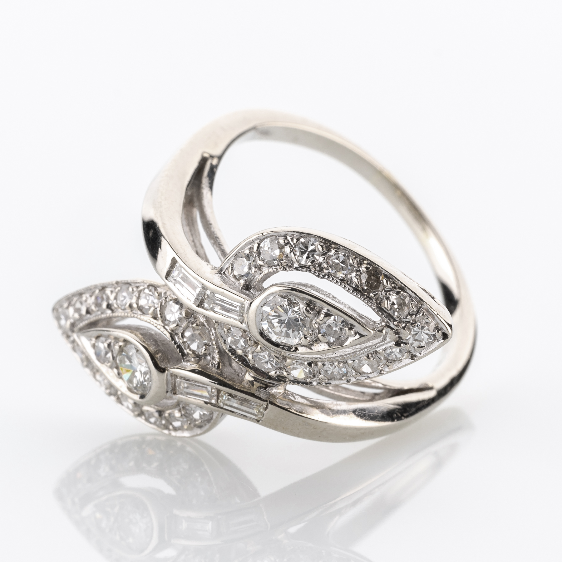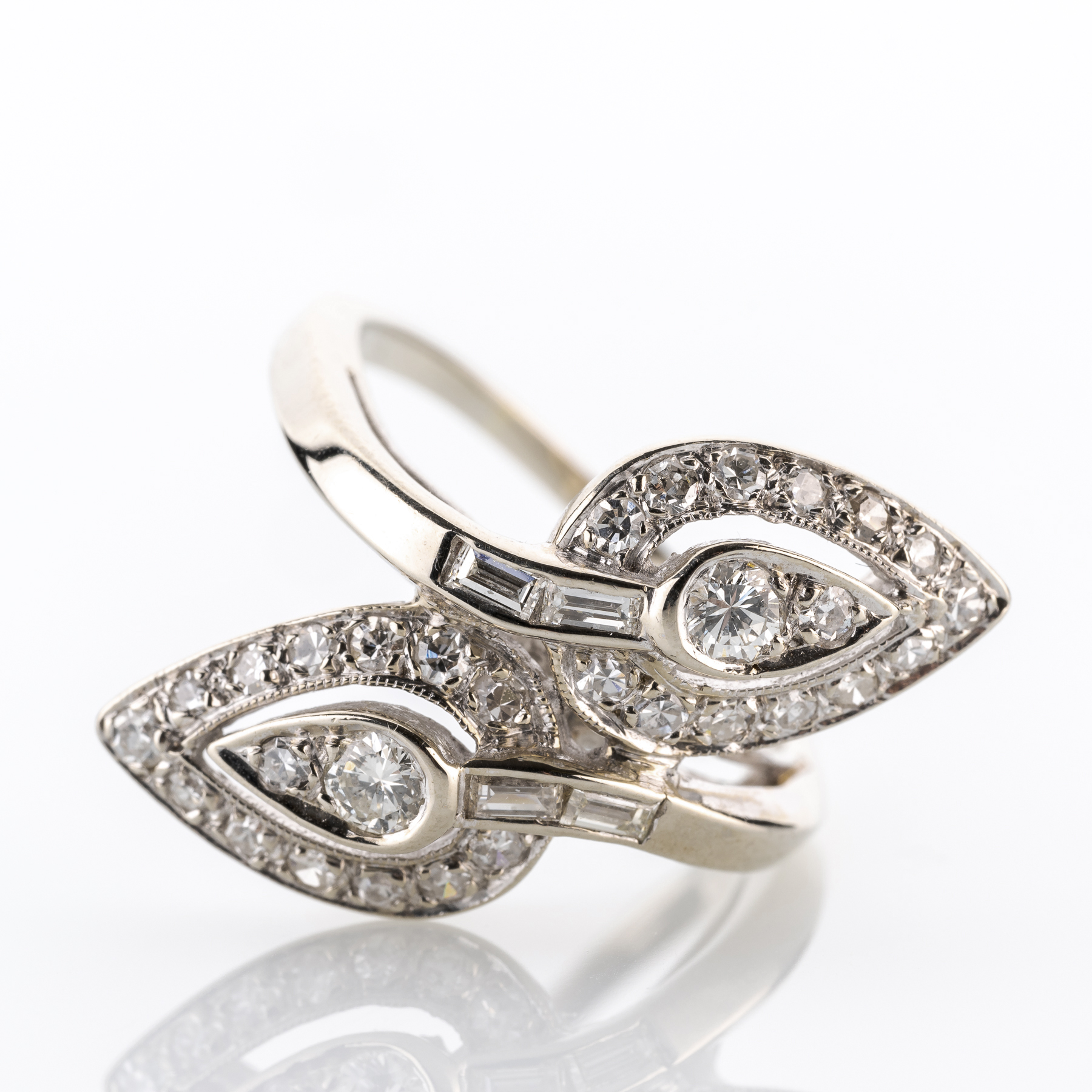 Bei diesem Schmuckstück wurde der Fokus klar auf strahlendes Weiß gelegt. Leuchtende Brillanten treffen dabei auf ein asymmetrisches Naturmotiv in hochwertigem 585er Weißgold.