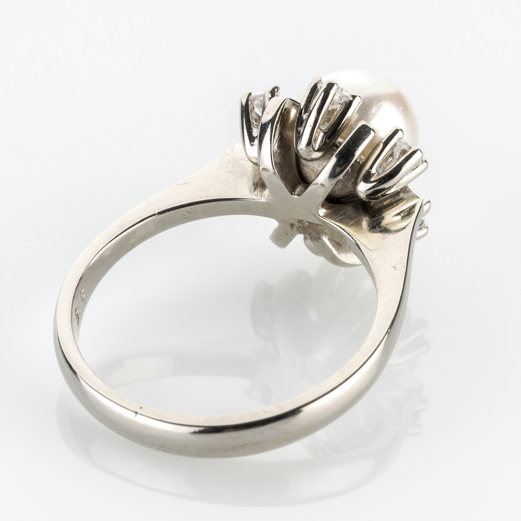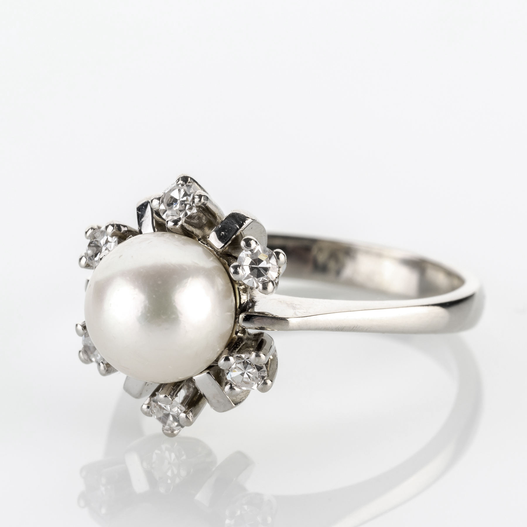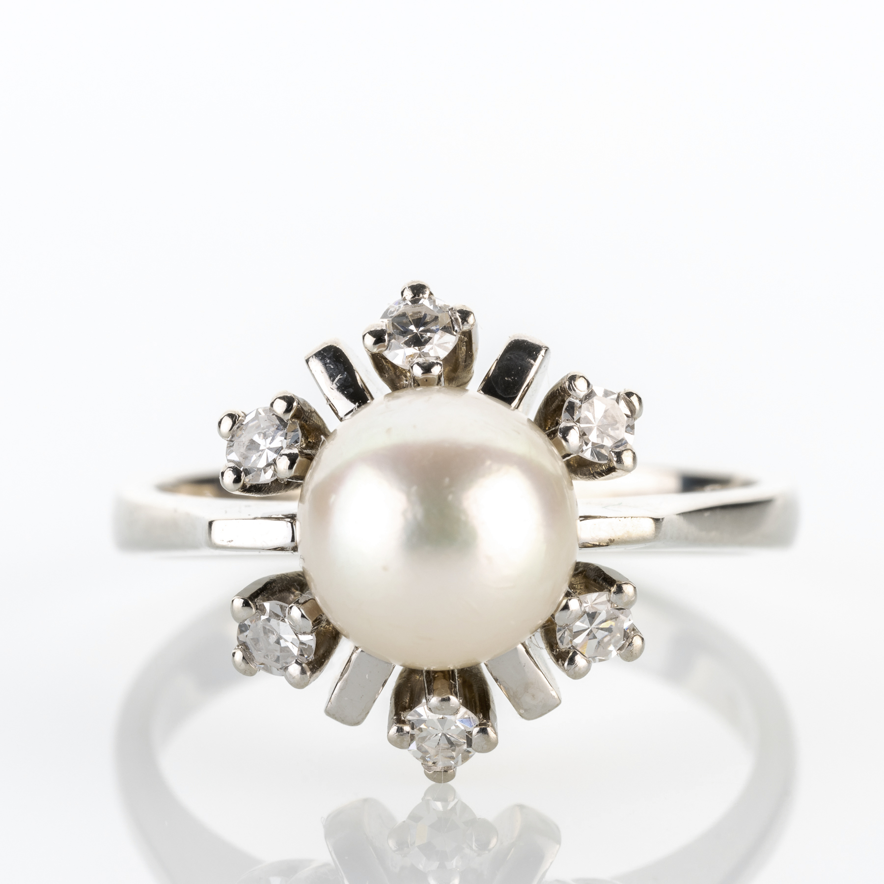 Ein eleganter perlenring aus den 1980er Jahren, der eigentlich in jeder Schmuckschatulle seinen Platz finden kann! Zentrales Element ist eine weiße Perle, die ganz klassisch von Brillanten eingerahmt ist.