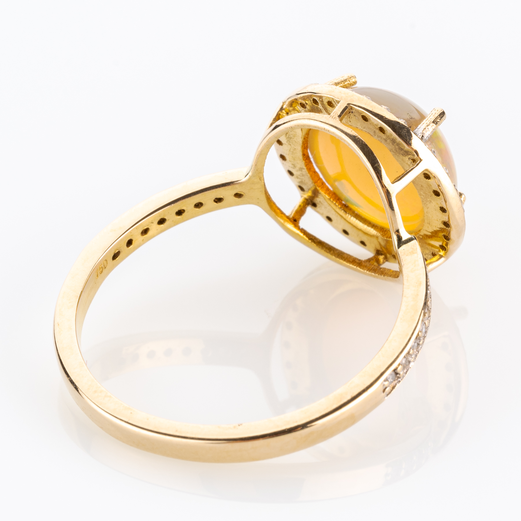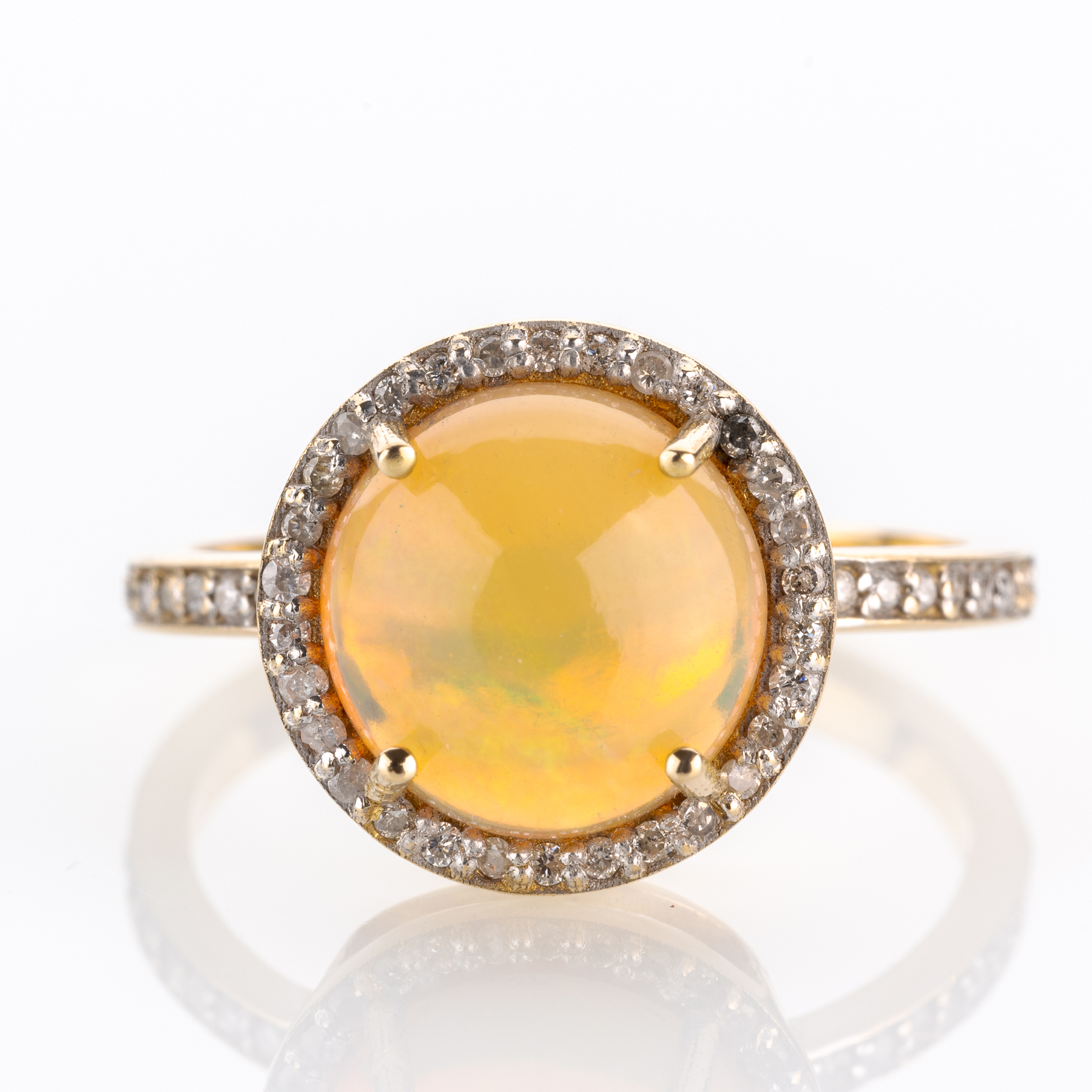 Opale zeichnen sich schon immer als Schmucksteine für Individualistinnen aus, vor allem durch das einzigartige Farbspiel jedes einzelnen Exemplars. Diesem runden Cabochon wurden dabei noch ein halbes Carat an Diamanten zur Seite gestellt.
