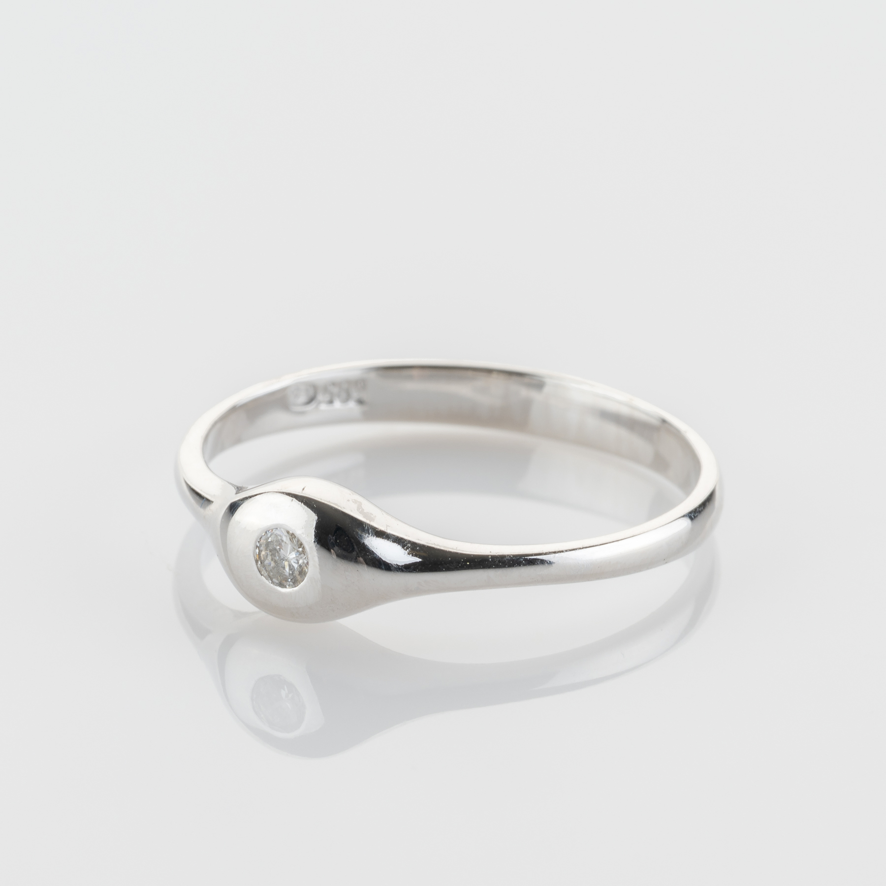 Dieser zarte Vintage-Ring aus den 1960er Jahren lebt vom Spiel weicher Linien und einer sanft modellierten Form. Die Ringschiene verläuft fließend in den gewölbten Ringkopf, der einen kleinen Brillanten wie eine glänzende Träne birgt. Zurückhaltend und doch mit klarer Präsenz – ein Stück für alle, die feine Gestaltung und Charakter lieben.
