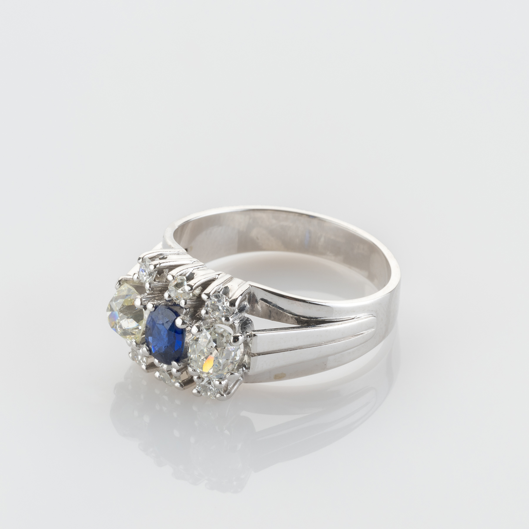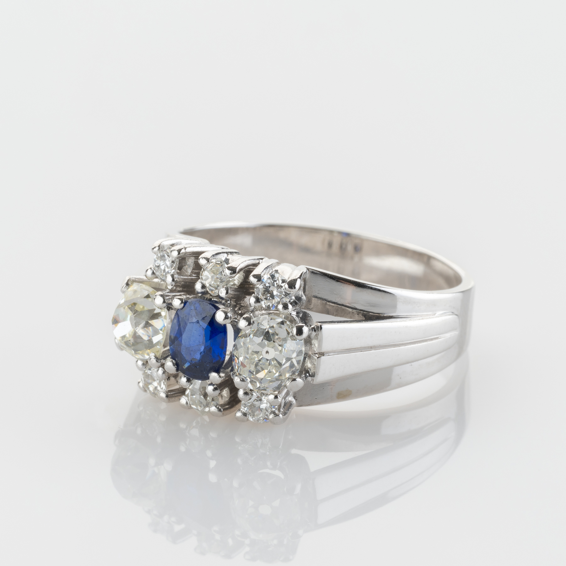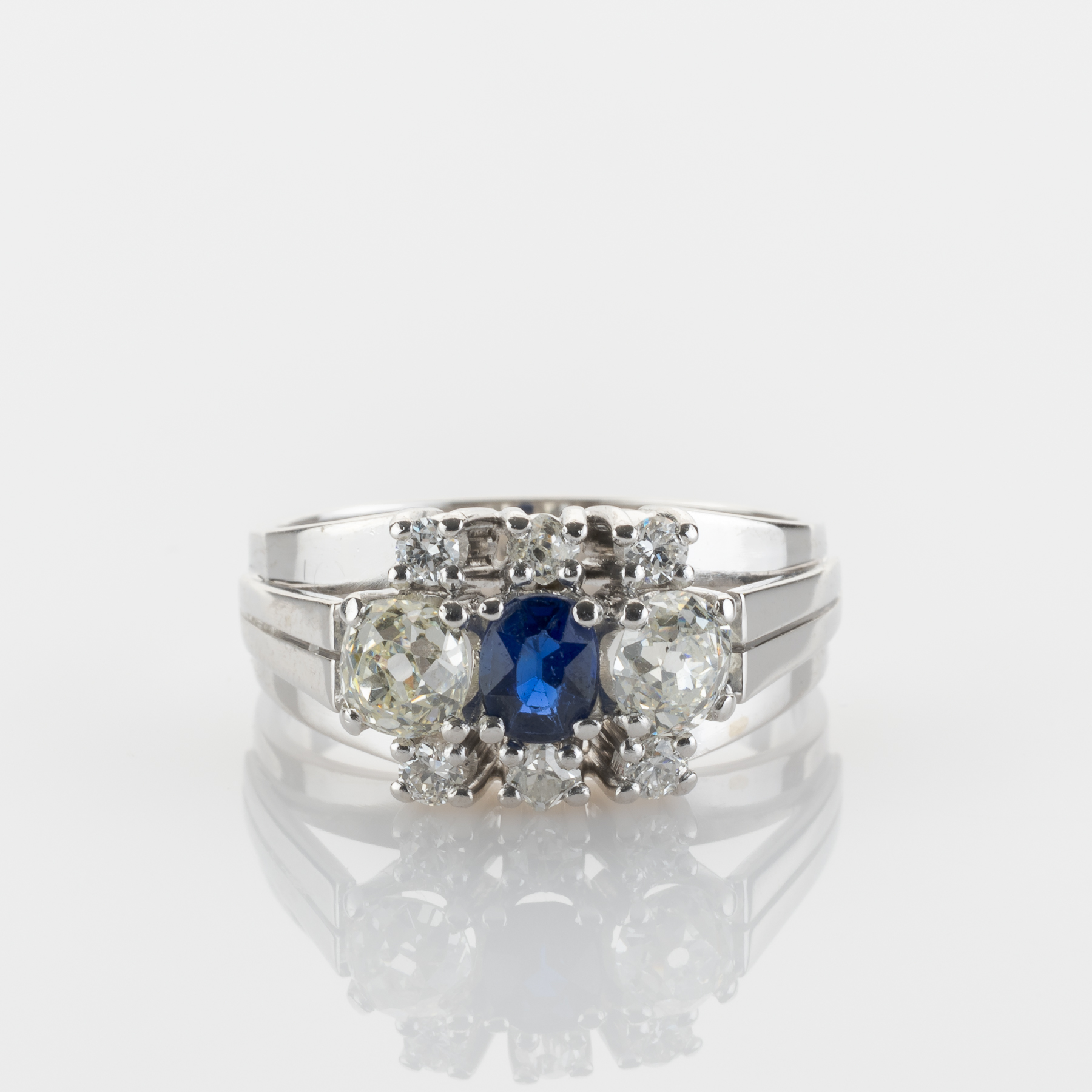 Herzstück dieses ausdrucksstarken Rings aus dem frühen 20. Jahrhundert ist einen leuchtend blauen Saphir, der von acht Diamanten im Altschliff flankiert wird - jeder mit seinem eigenen einzigartigen Funkeln und zeitlosen Charme. Das sanfte Leuchten antiker Facetten trifft in diesem eleganten und geschichtsträchtigen Stück auf die Klarheit modernen Designs. Ein echter Charakterring mit Seele.