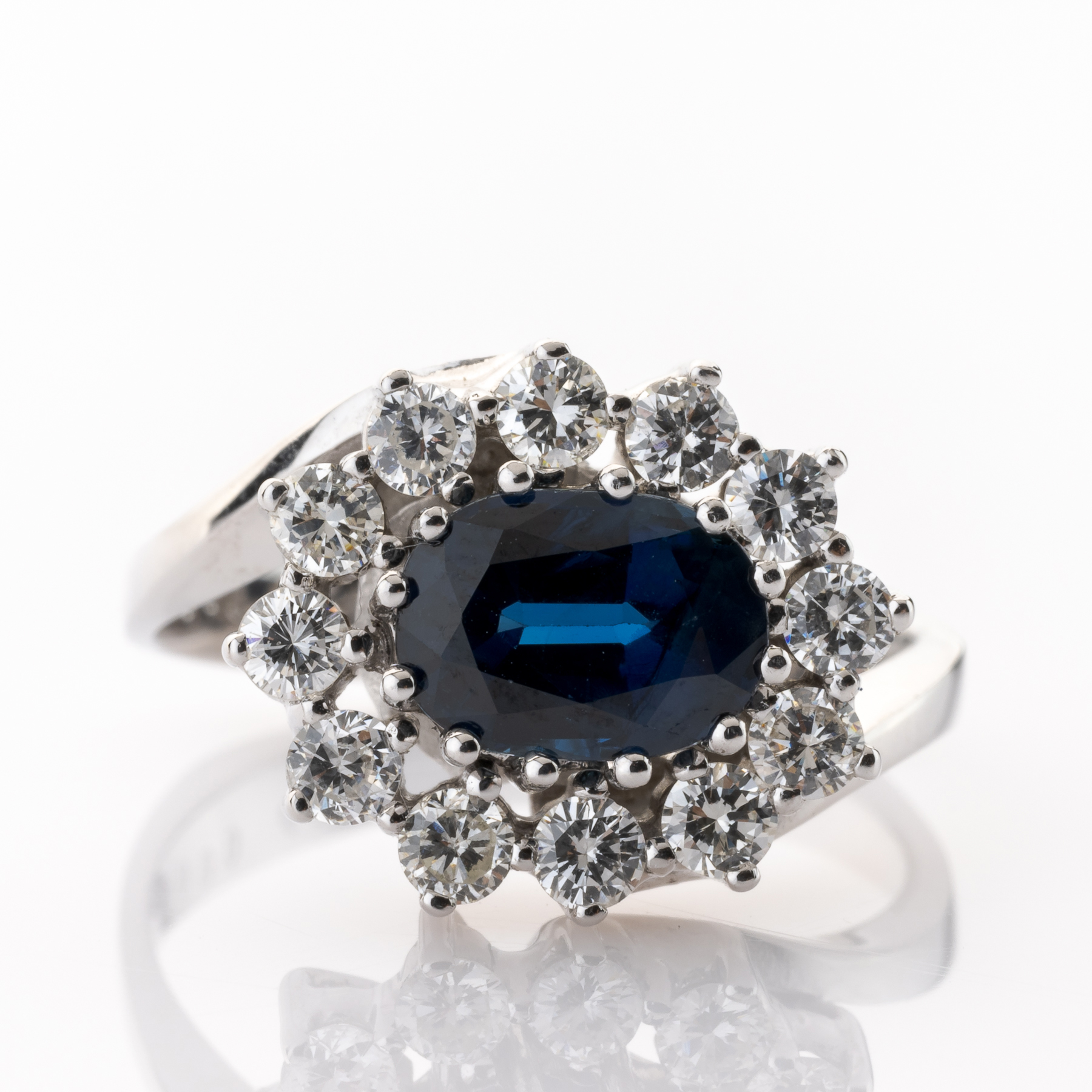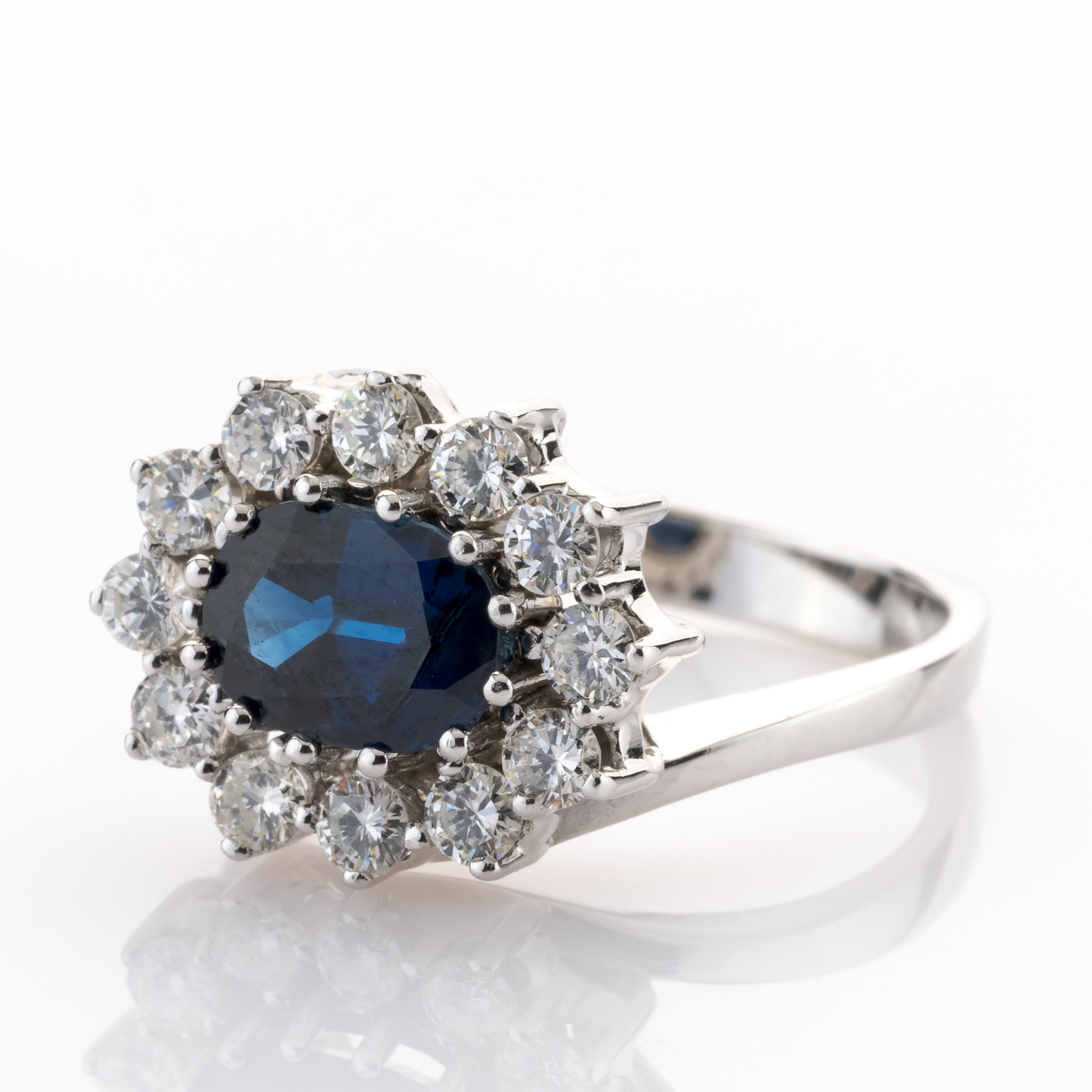 Dieses fabelhafte Schmuckstück begeistert durch eine gekonnte Kombination von Tradition und Moderne. Der von Brillanten eingefasste Saphir ist ein absoluter Klassiker der Schmuckwelt, der in dieser Version durch seine Asymmetrie im Design zu etwas ganz Besonderem wird.