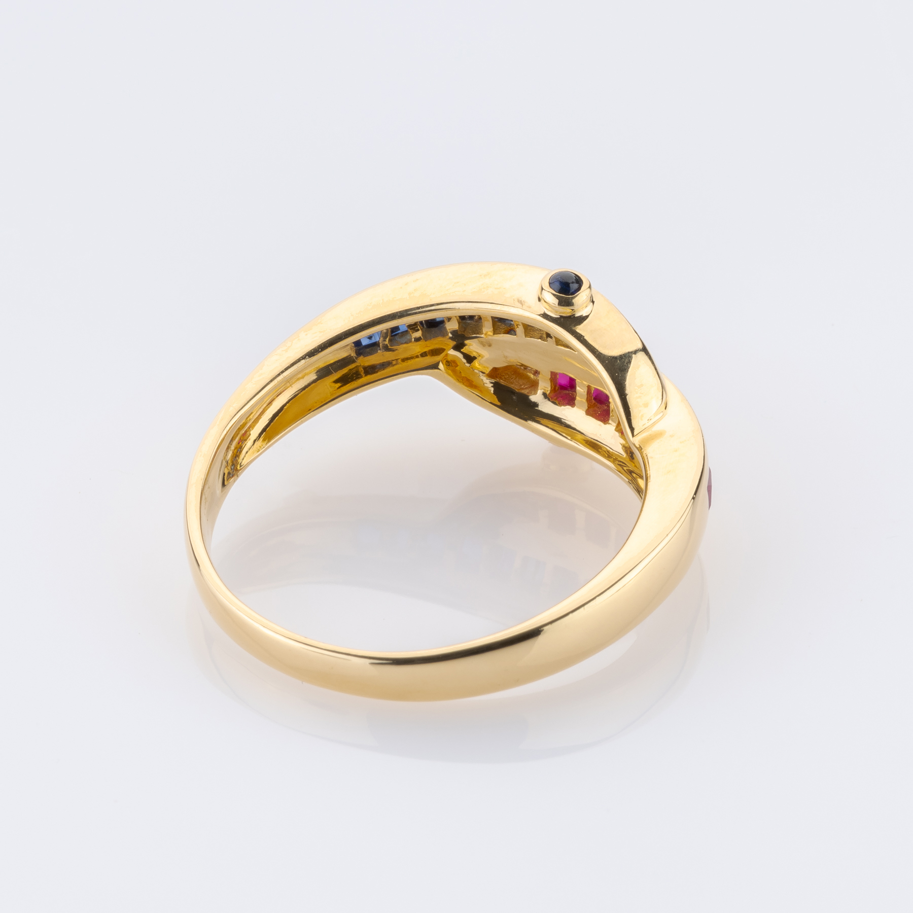 Ein Ring, der Farbe und Form in perfekter Balance vereint: In leuchtendem 750er Gelbgold verschlingen sich zwei geschwungene Linien – eine aus tiefblauen Saphiren, die andere aus strahlend roten Rubinen. Zwei kleine Diamanten fangen das Licht dazwischen ein und setzen glitzernde Akzente.