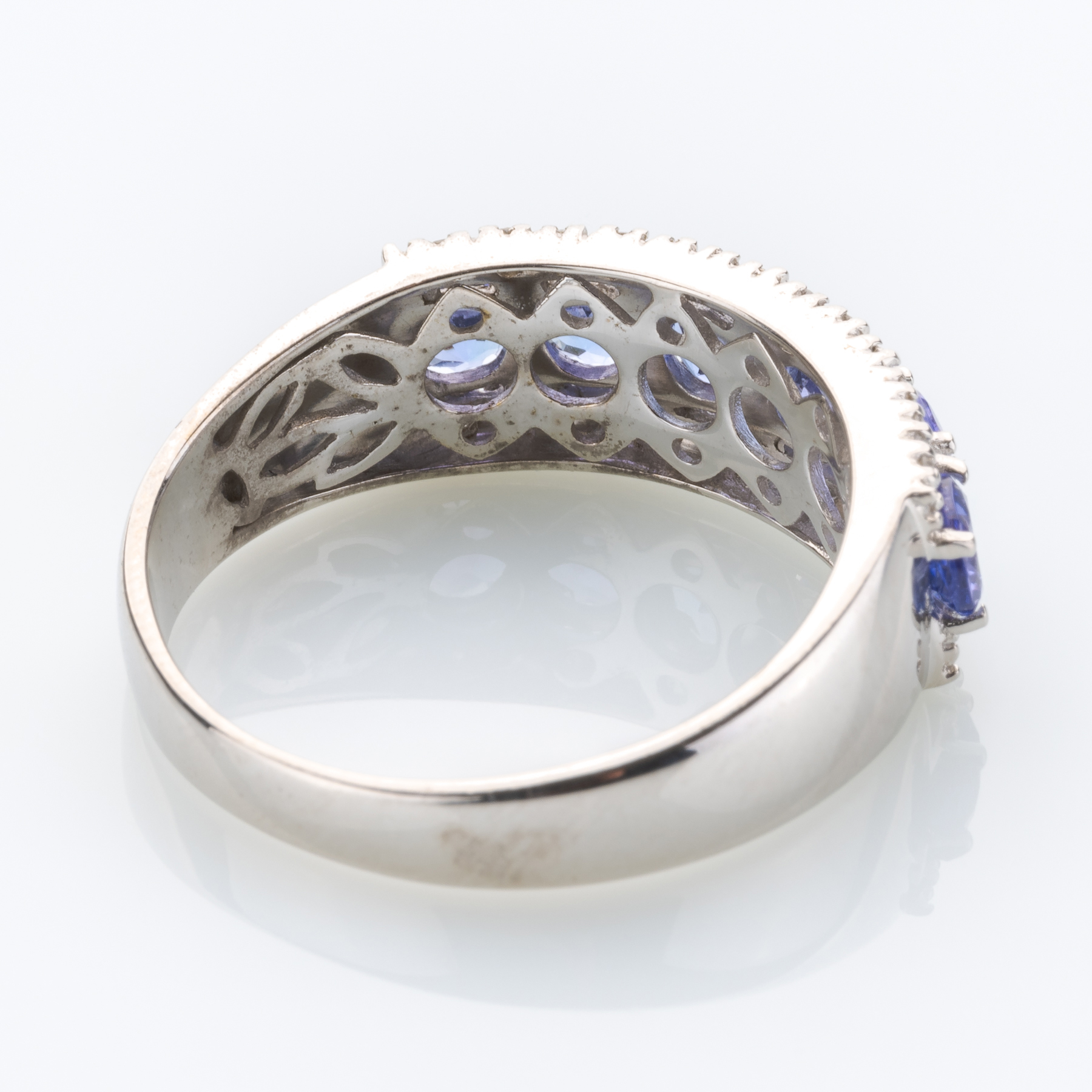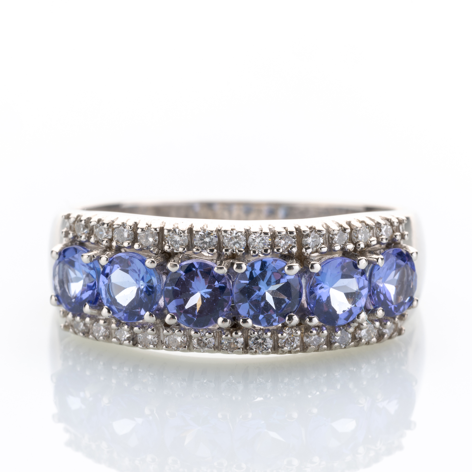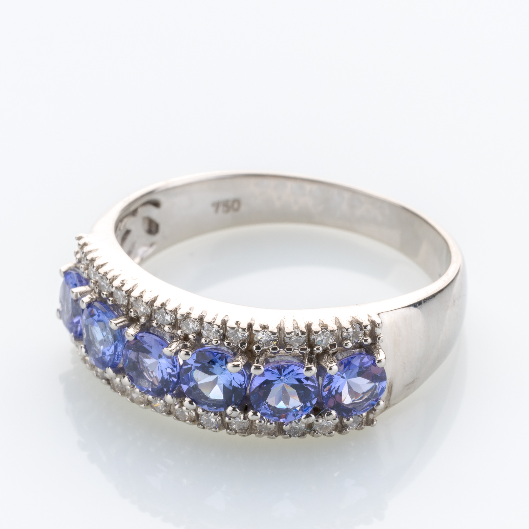 Dieses elegante Schmuckstück glänzt vor allem durch seinen leuchtenden Besatz in Form eines halben Dutzends facettierter Tansanite. Diesen hat man dabei noch 26 Diamanten zur Seite gestellt.
