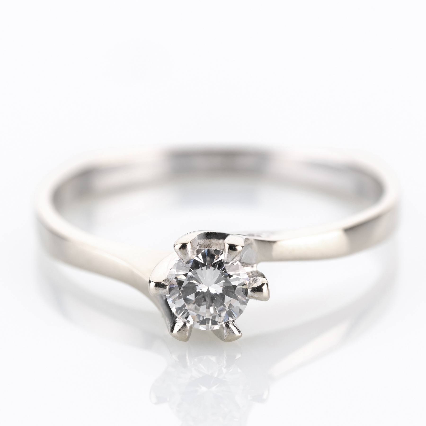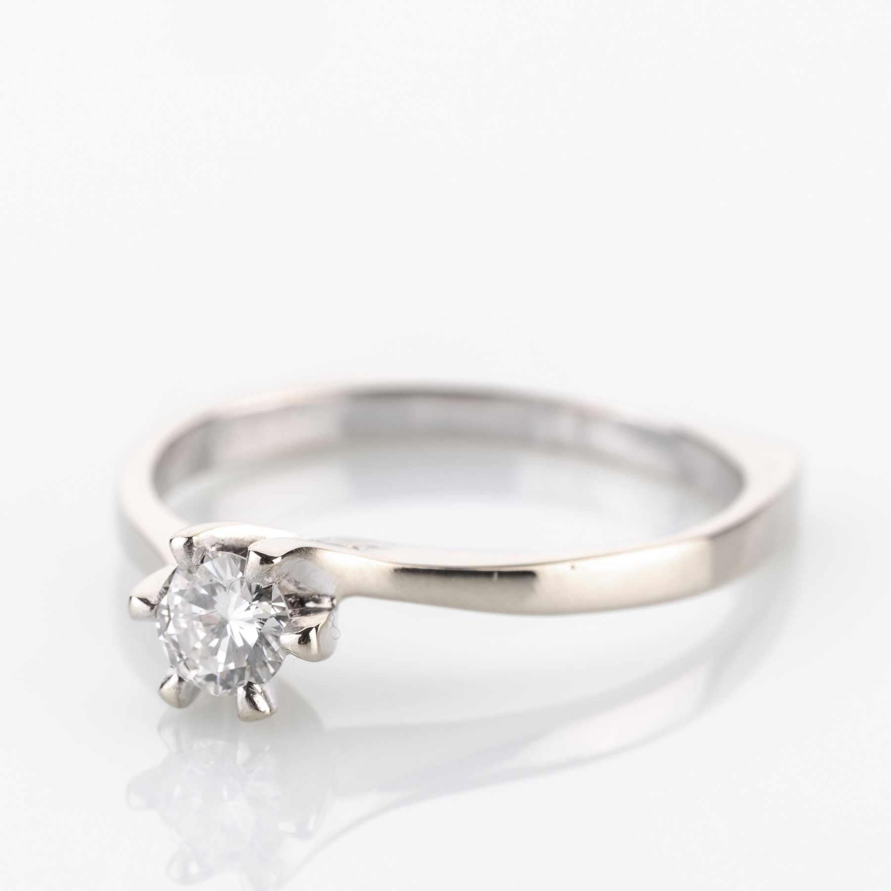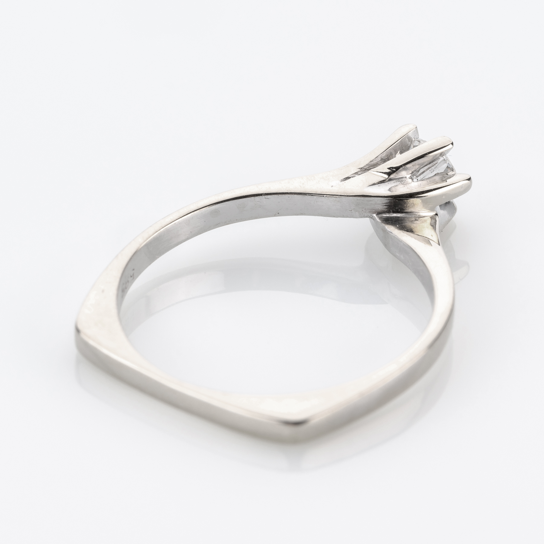Eine etwas verspieltere Variante des Solitärrings, gefertigt in den 1970er Jahren, der das klassische Konzept etwas schwungvoller umsetzt und man sich für einen Viertelkaräter als Besatz entschieden hat.