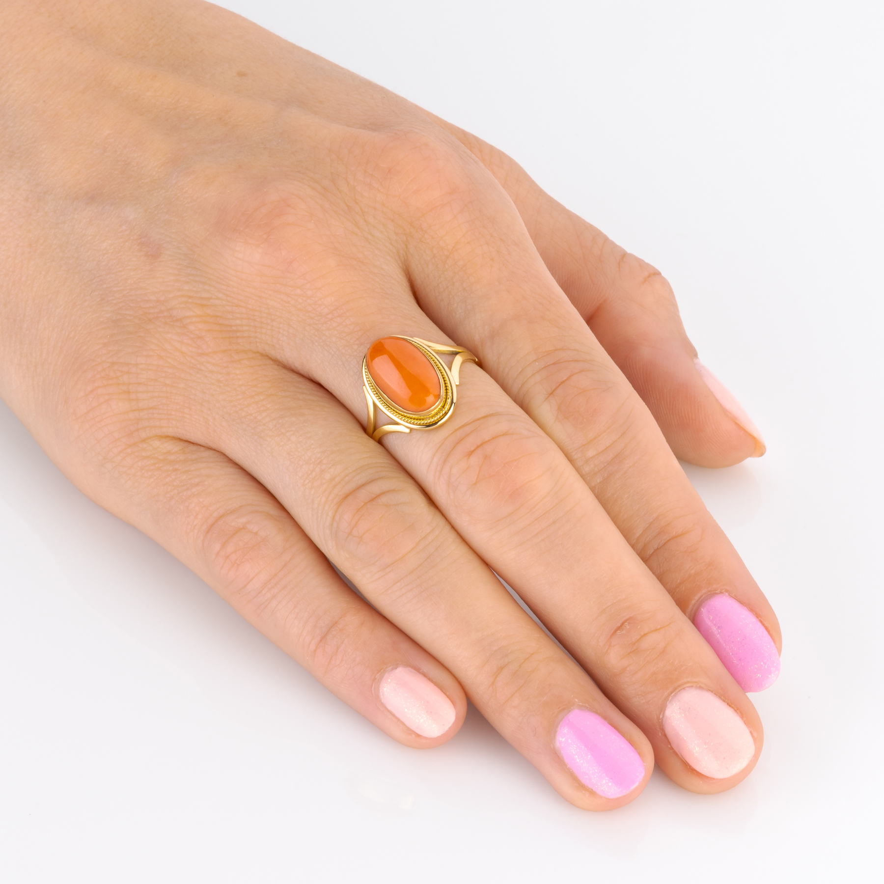 Auch wenn sie mittlerweile seltener werden sind Stücke wie dieser Damenring aus Italien immer noch ein absoluter Retro-Klassiker. Elegantes von der Jahrhundertwende inspiriertes Design trifft dabei auf einen Cabochon aus Edelkoralle in schöner Farbe.