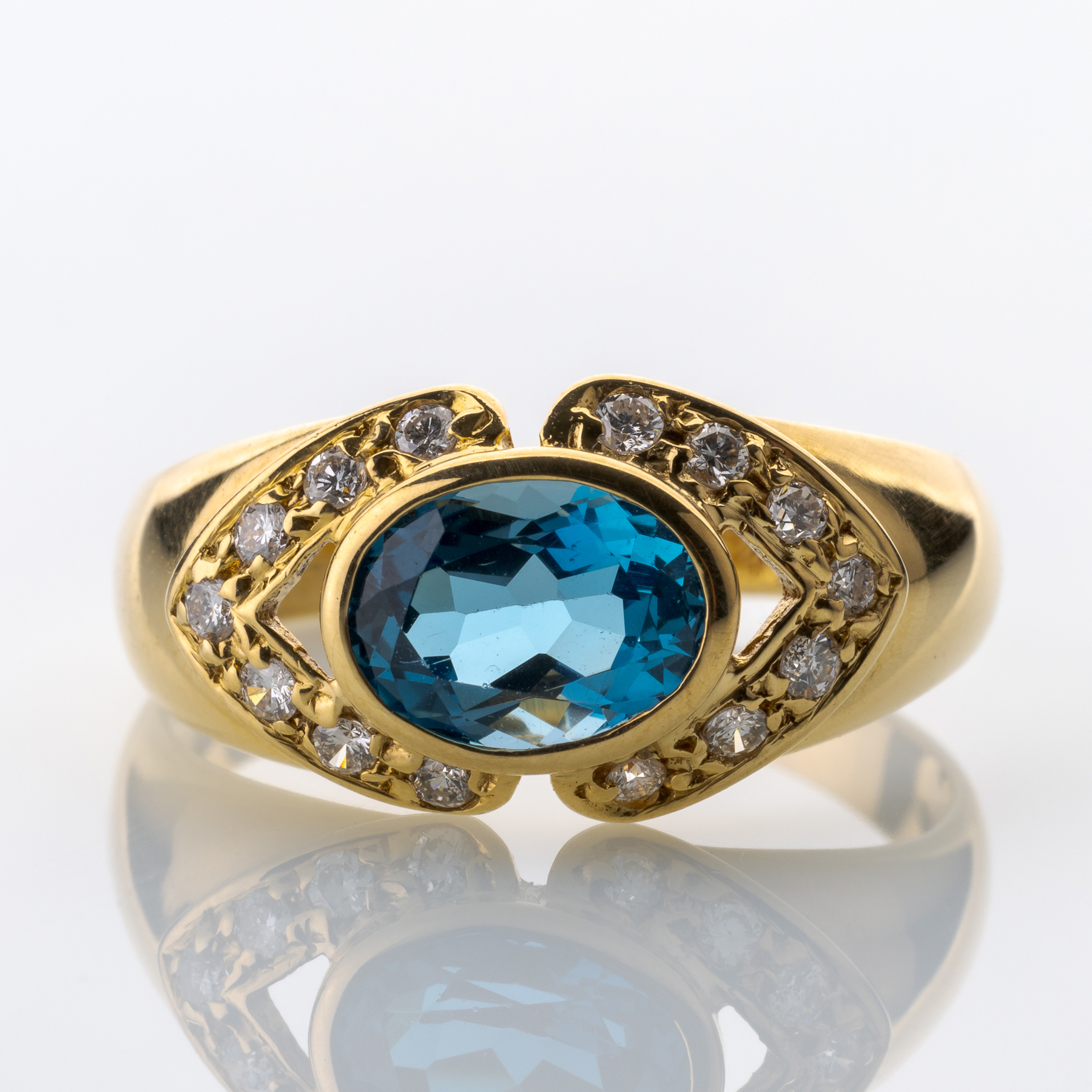 Blickfang dieses eleganten Vintage-Rings ist ein Blautopas, umgeben von vierzehn funkelnden Brillanten, die seine zarte Erscheinung betonen. Der Blautopas, bekannt für seine beruhigende, aquatische Farbe, gilt seit Jahrhunderten als Stein der Ruhe und Inspiration.