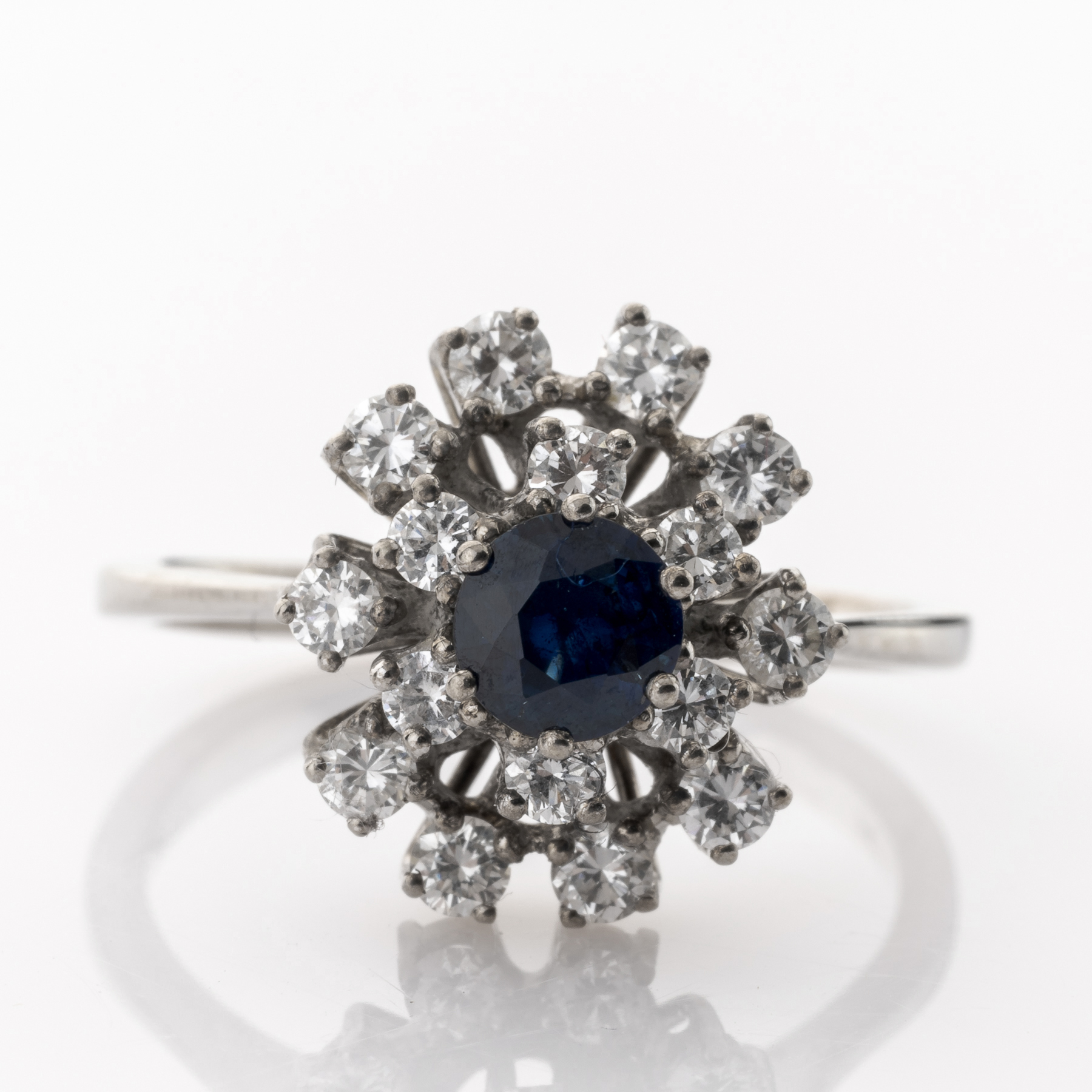 Ein Saphir, umschlossen von einem Kranz aus funkelnden Brillanten – dieser Klassiker ist aus der Schmuckwelt nicht mehr wegzudenken! Bei diesem eleganten Vintage-Ring wurde als Herzstück ein rund facettierter Saphir in kräftigem Blau gewählt, der nochmals mit einem lockeren Arrangement von 16 Brillanten umgeben ist.