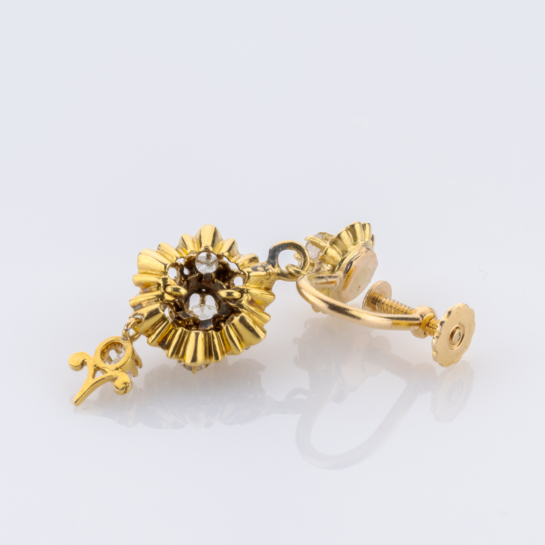 These antique earrings capture the elegance of a bygone era with their finely pierced goldwork and floral lightness. Each old-cut diamond nestles in a filigree setting like morning dew on petals. The yellow gold glows with warmth, lending the piece a timeless grace – quietly radiant, profoundly crafted.