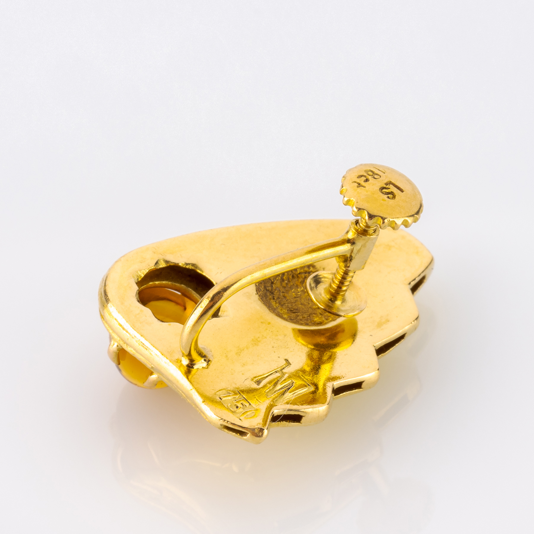 These breathtaking earrings were made around the 1920s, featuring two beautiful cabochon-cut citrines. The warm yellow color of the gold beautifully complements the golden-yellow hues of the citrines, creating a luxurious and elegant look. With their unique design and the charm of this creative era, these earrings are sure to become a treasured addition to any antique jewelry collection.