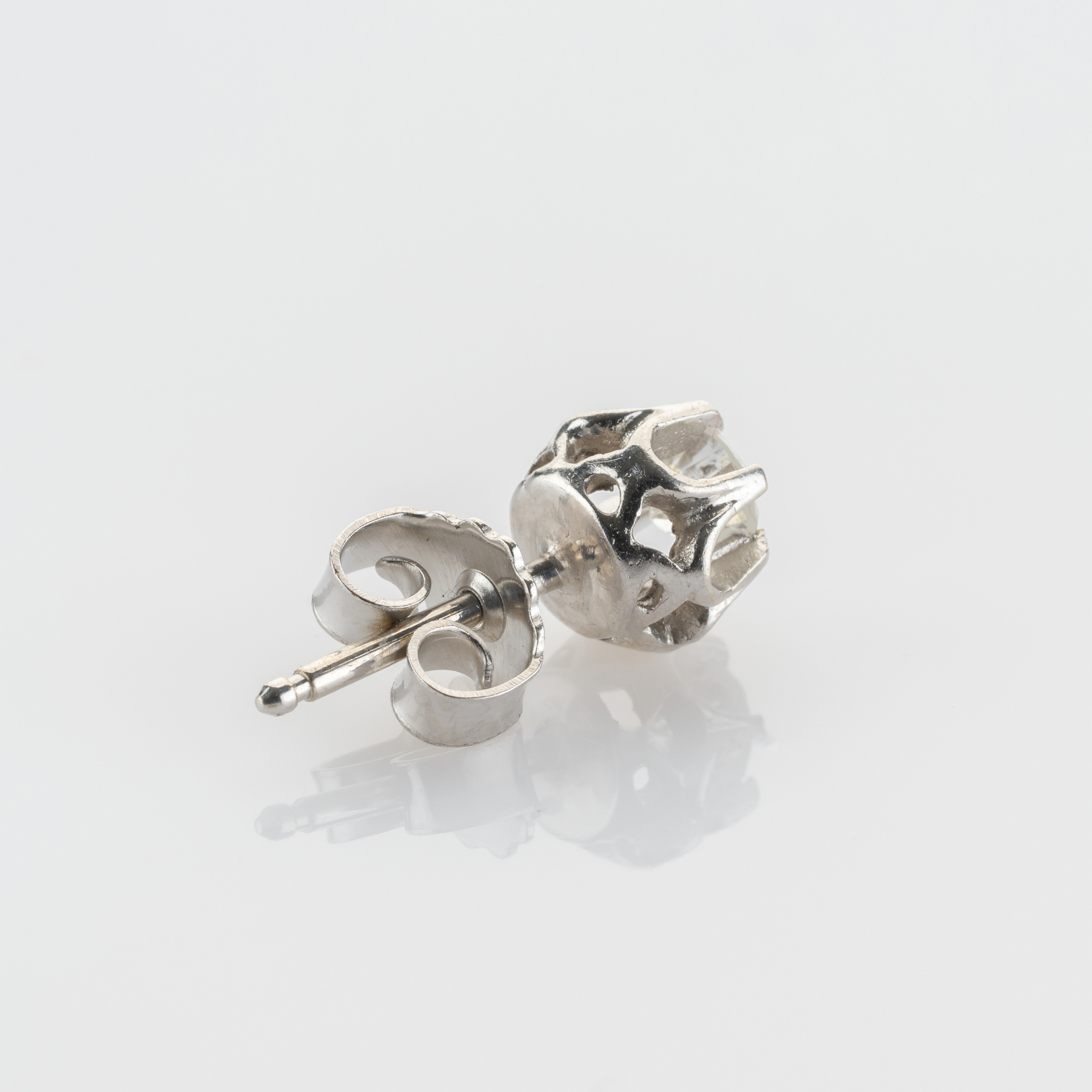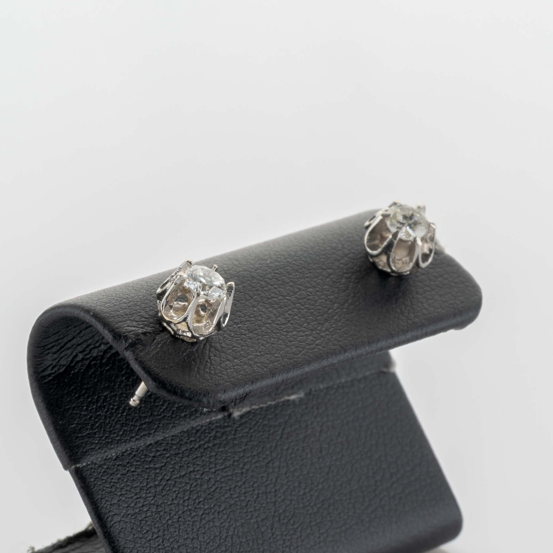 These vintage stud earrings from the 1950s feature a clean, understated design with a cool white gold finish. Two diamonds, delicately framed in a petal-like setting, radiate subtle brilliance. A graceful nod to midcentury style, perfect for contemporary elegance.