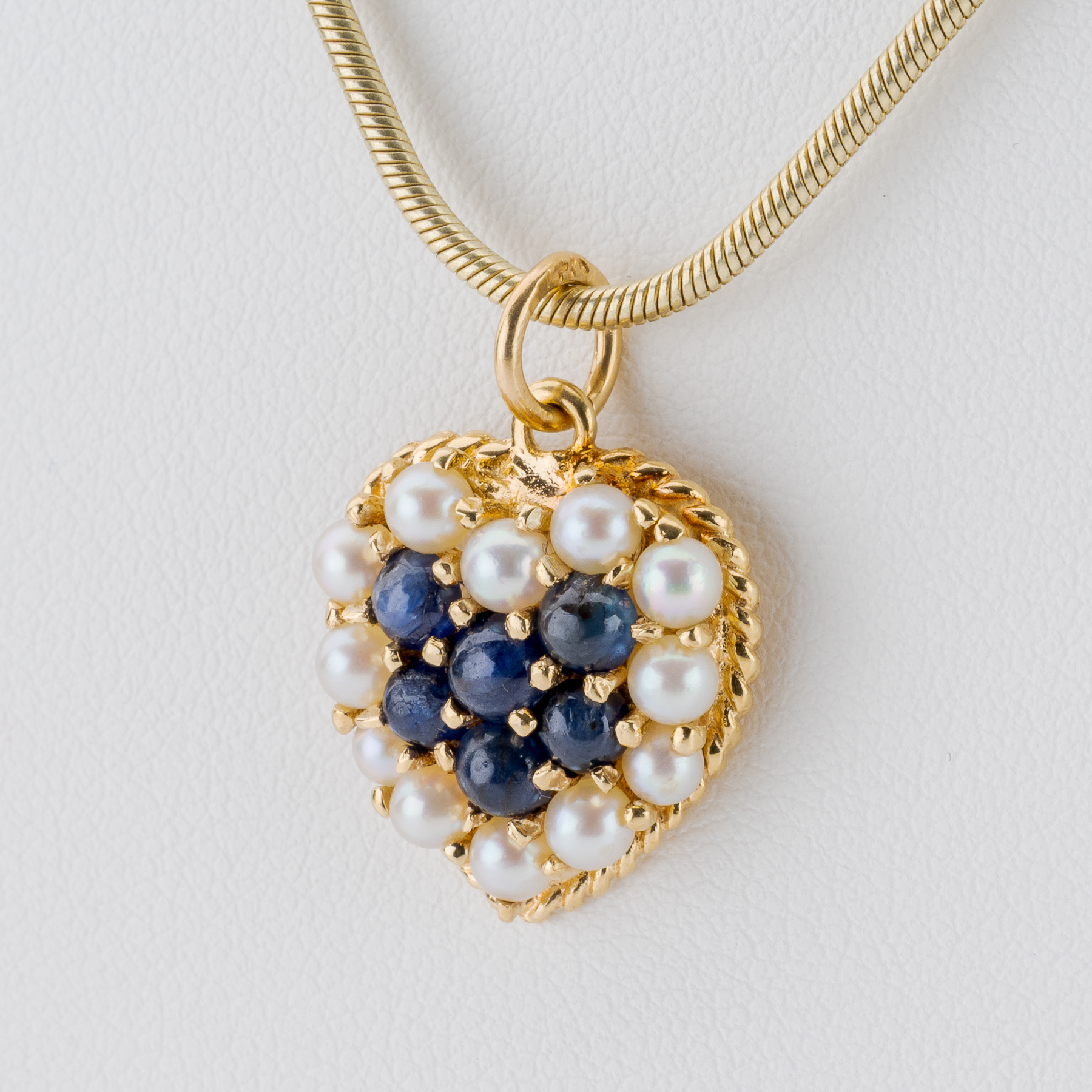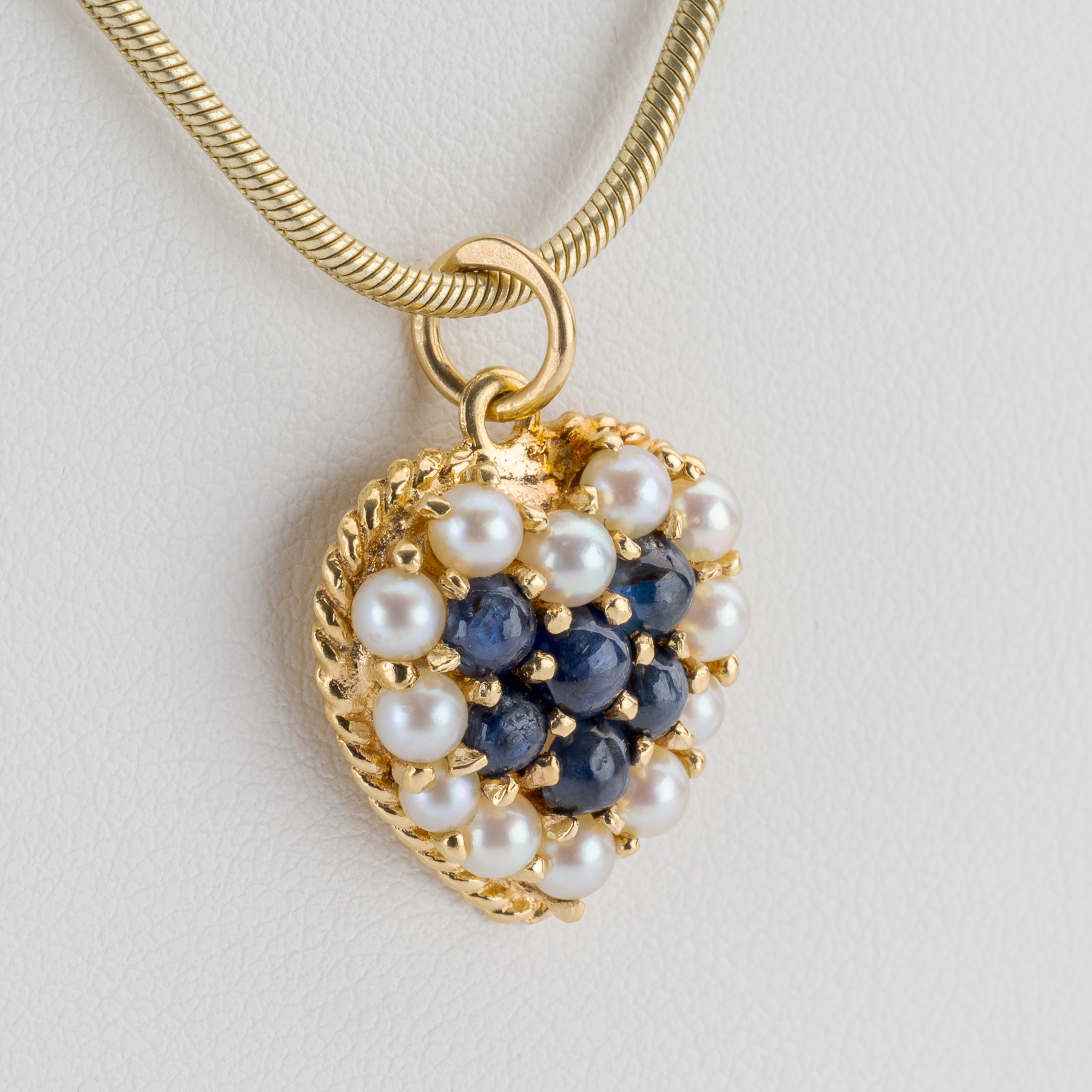 This heart-shaped pendant is defined by a gold cord with a clear edge. Sapphire blue adds depth in the center, while the pearls reflect a soft glow. The result is an extraordinary, playful piece of jewelry for romantics.