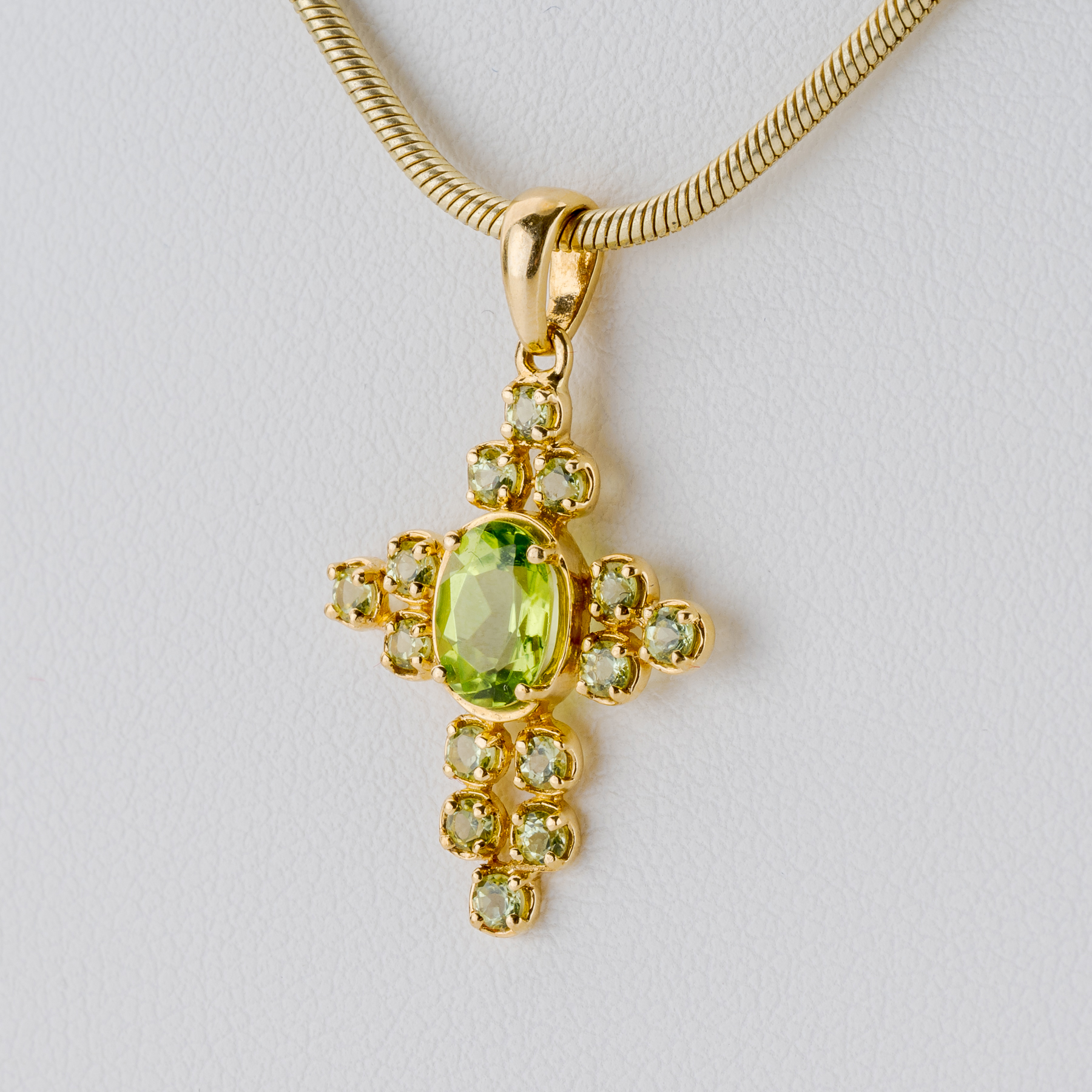 This cross carries a fresh green glow that feels like sunlight held in place. An oval peridot anchors the design, while smaller stones build a quiet rhythm around it. Warm yellow gold gives the piece presence without heaviness, and the light stays close to the skin as it moves.