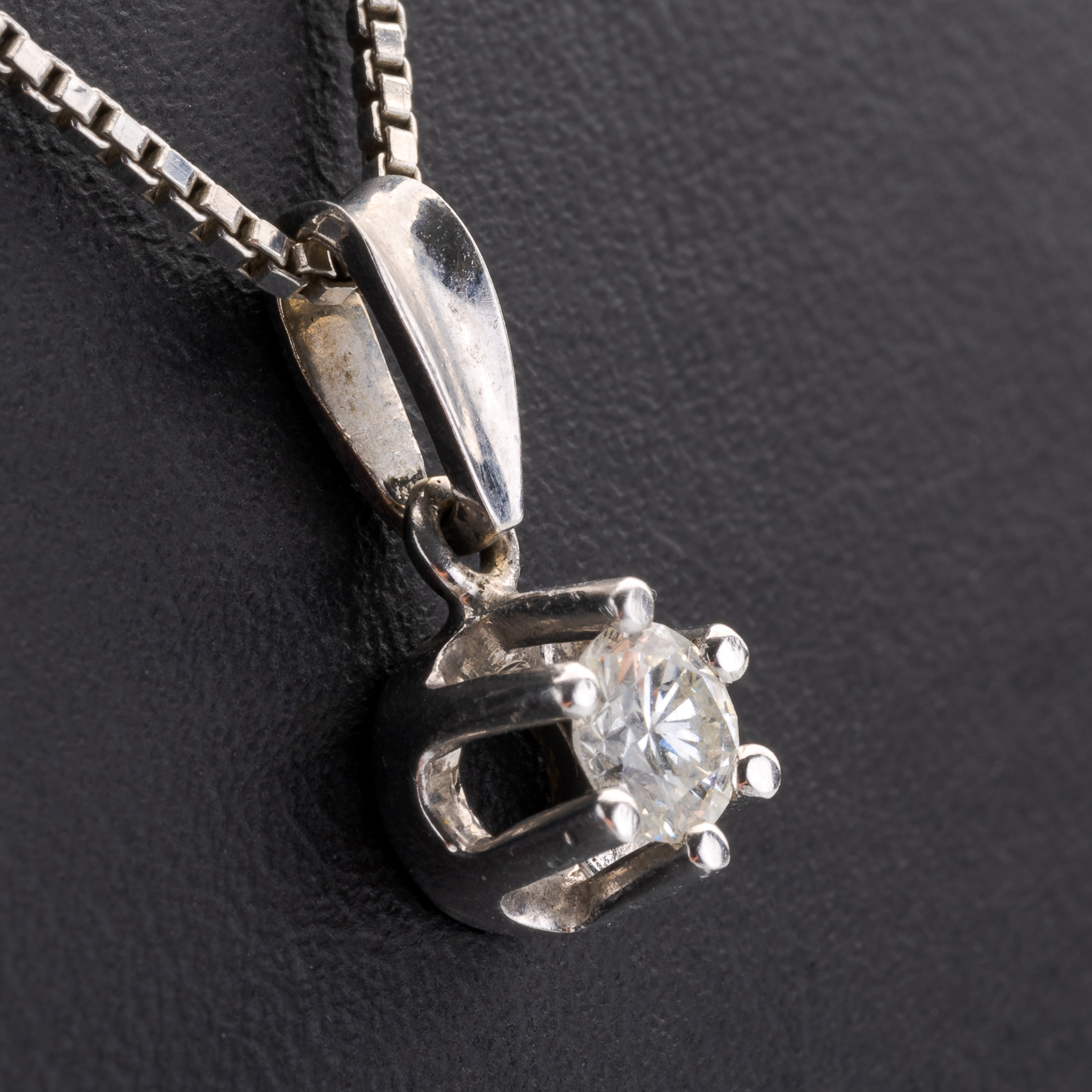 Embodying the essence of minimalistic elegance, this white gold pendant features a sparkling quarter carat diamond. Its sleek design and pure lines create a timeless addition to any wardrobe.