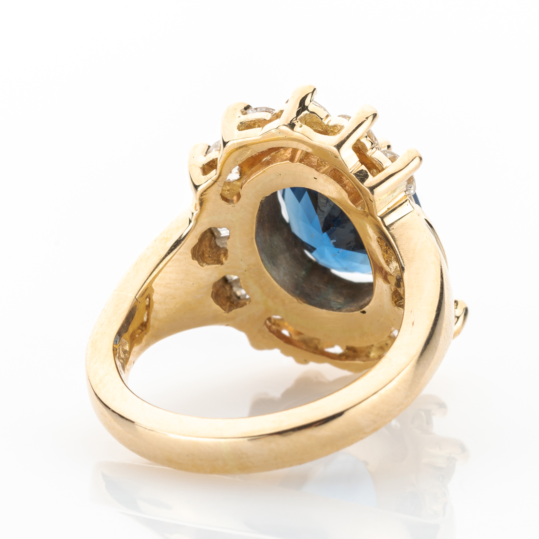 This piece of jewelry is a classic design reworked and enhanced. It is based on the classic colored gemstone, in this case a 4.25 carat sapphire, embraced by diamonds concept, but not only using round cut diamonds, but also a set of baguette cut diamonds.