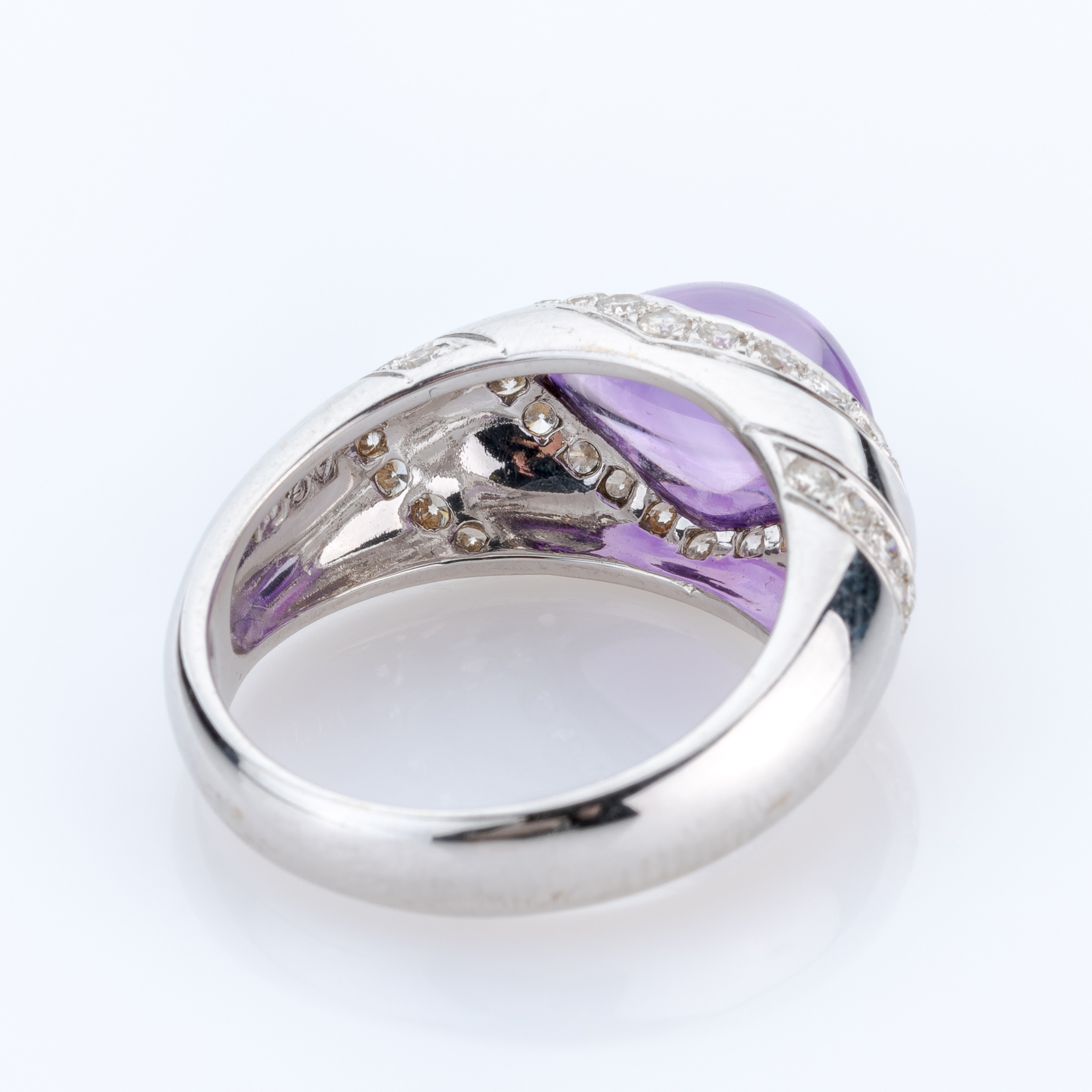 An unusual white gold ring from the 1990s, pairing timeless design with a vivid amethyst cabochon and a set of over thirty petite diamonds.